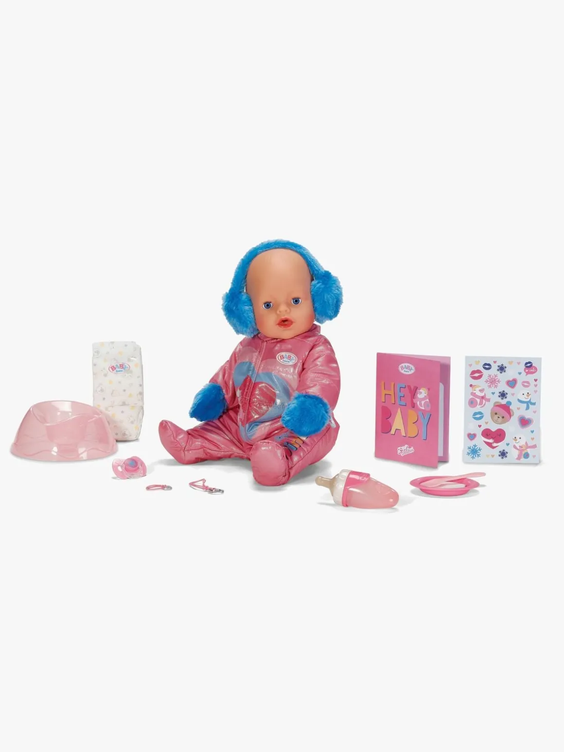– Indeholder: 1 dukke, 1 potte, 1 ble, 1 tallerken, 1 ske, 1 sutteflaske, 1 sut, 2 venskabsarmbånd, 1 ørepude.