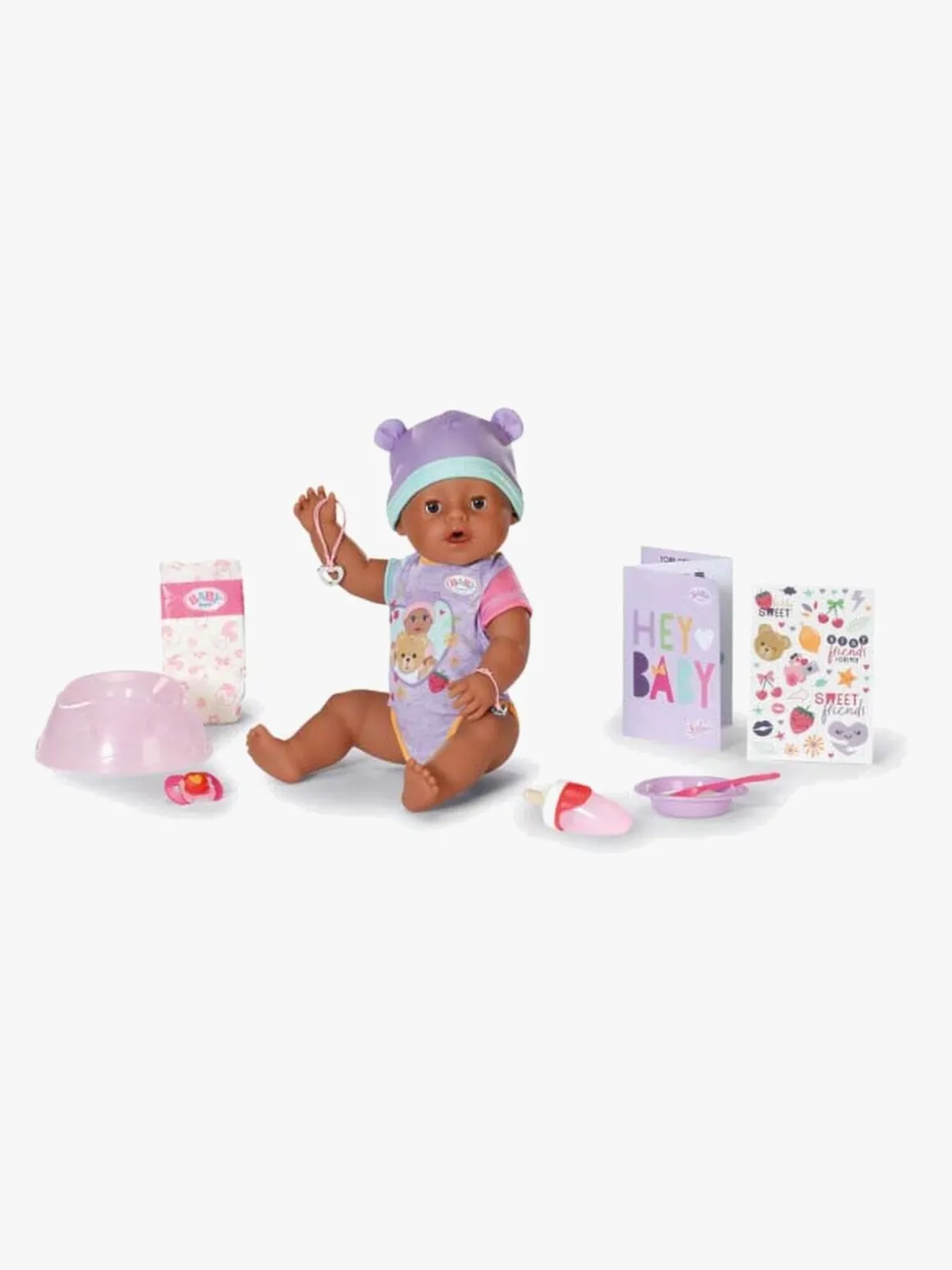 – Indeholder: 1 dukke, 1 potte, 1 ble, 1 tallerken, 1 ske, 1 sutteflaske, 1 sut, 2 venskabsarmbånd, 1 fødselsattest.