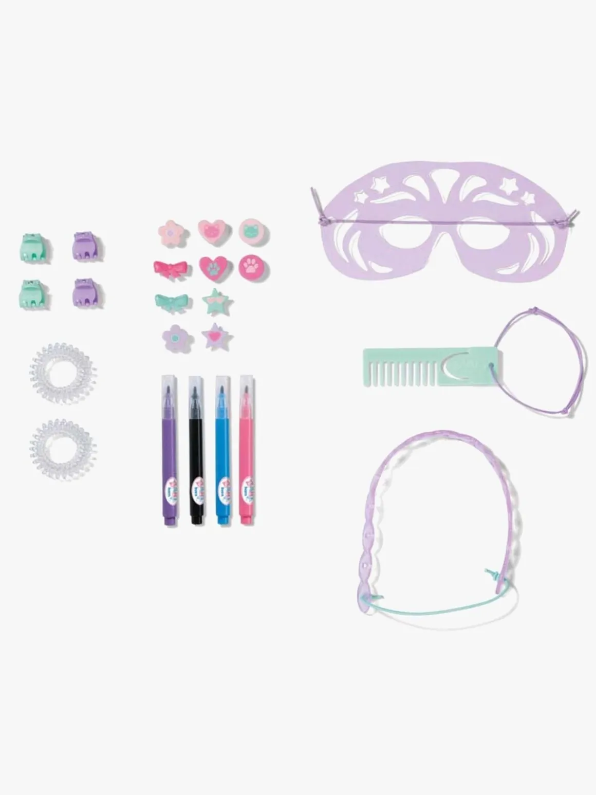 – Indeholder: 1 frisør- og sminkedukke, 4 tusser, 1 skabelon, 1 kam, 1 hårbånd, 10 vedhæng, 4 hårklemmer, 2 hårelastikker.