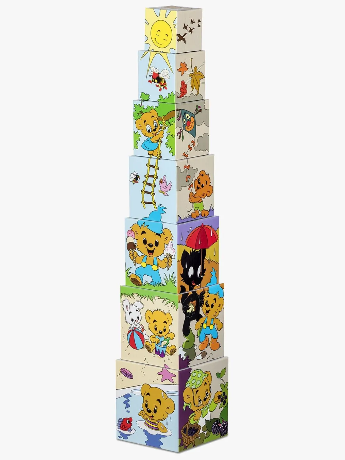 De syv klodser passer ind i hinanden, så barnet kan lære noget om størrelsesforhold. Når alle klodserne er stablede ovenpå hinanden måler tårnet 64 cm.