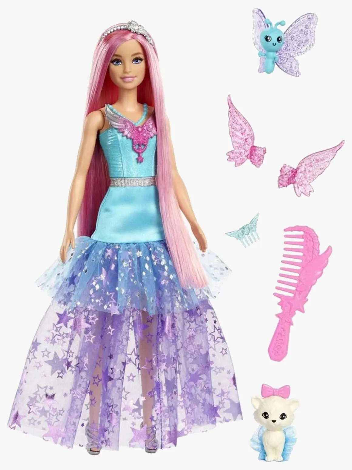 – Indeholder: 1 Barbiedukke, 1 par vinger, 2 kæledyr, 1 kam, 1 hårbånd, 1 hårsmykke.