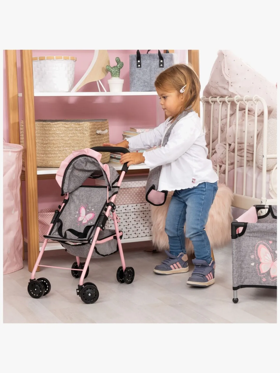 – Indeholder: 1 dukkevogn, 1 pusletaske, 1 dukkeseng, 1 sovepose, 1 aktivitetstæppe, 1 tallerken, 1 ske, 1 gaffel, 1 kniv, 1 tudekop.