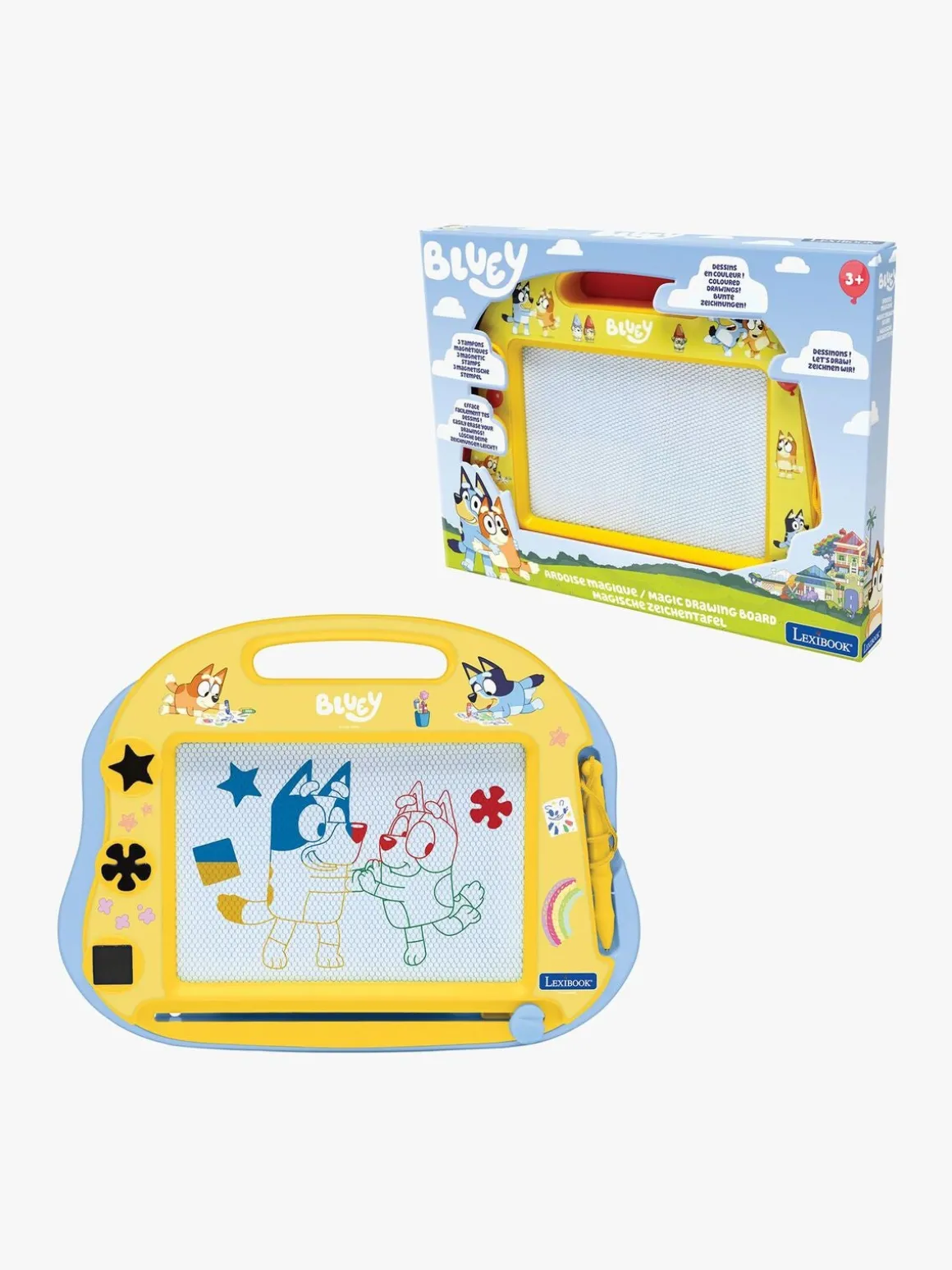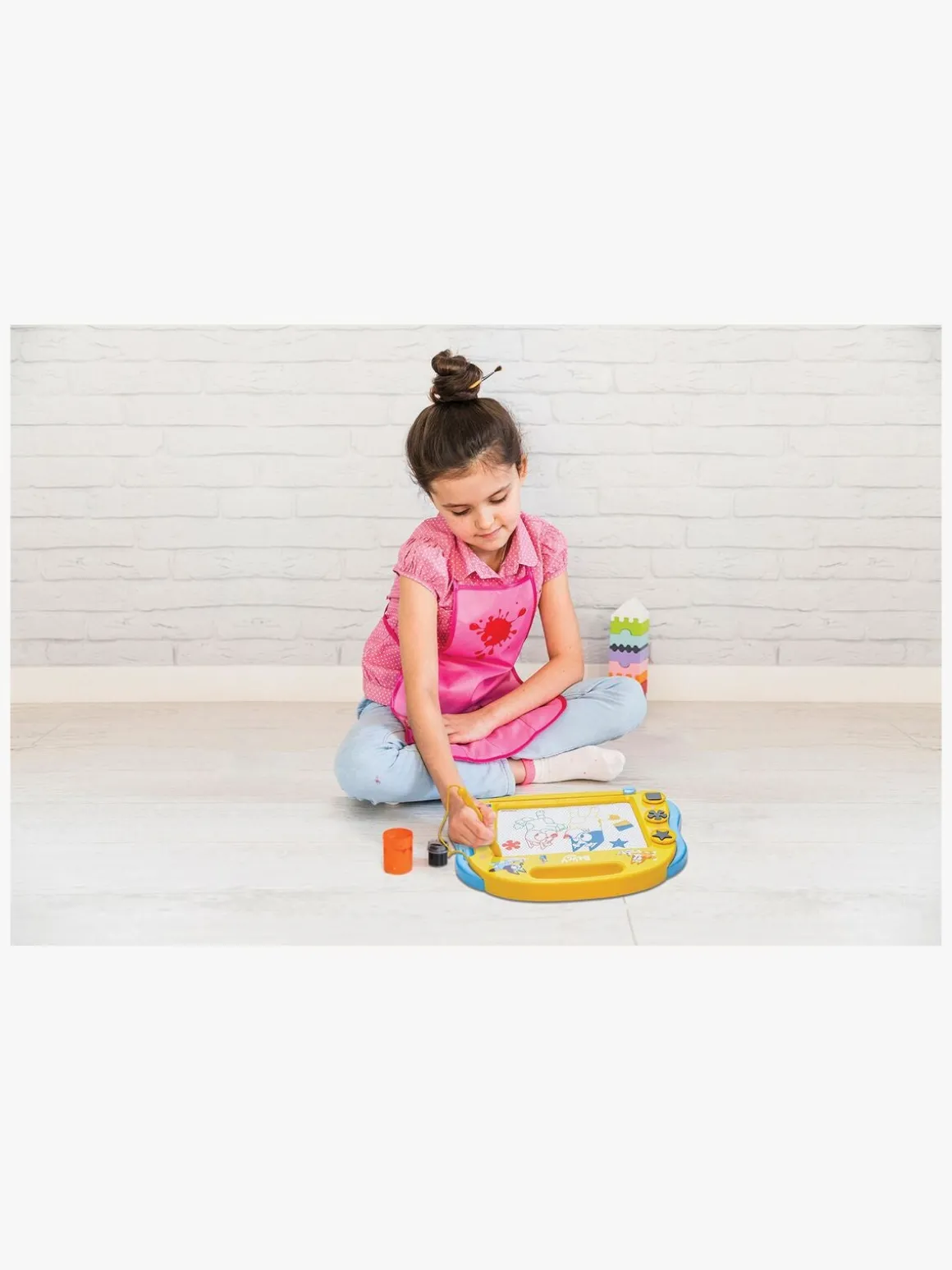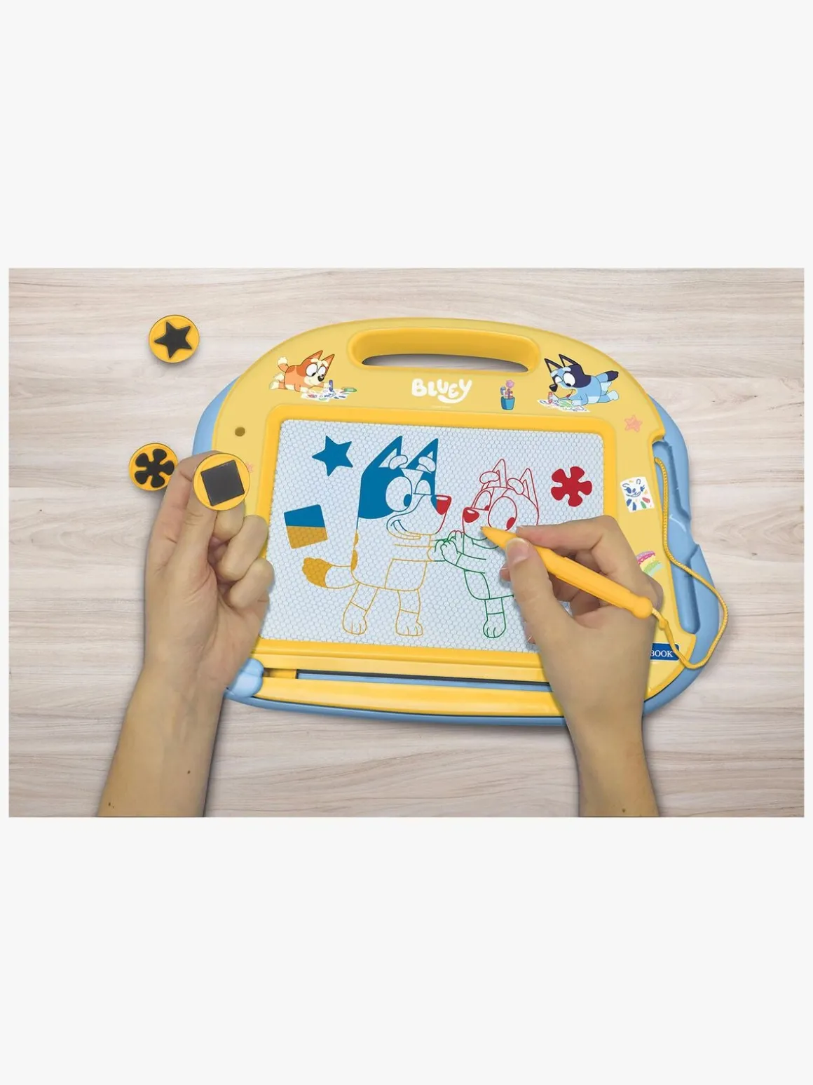 – Tegn med den magnetiske pen, eller lav sjove kunstværker med stemplerne.
