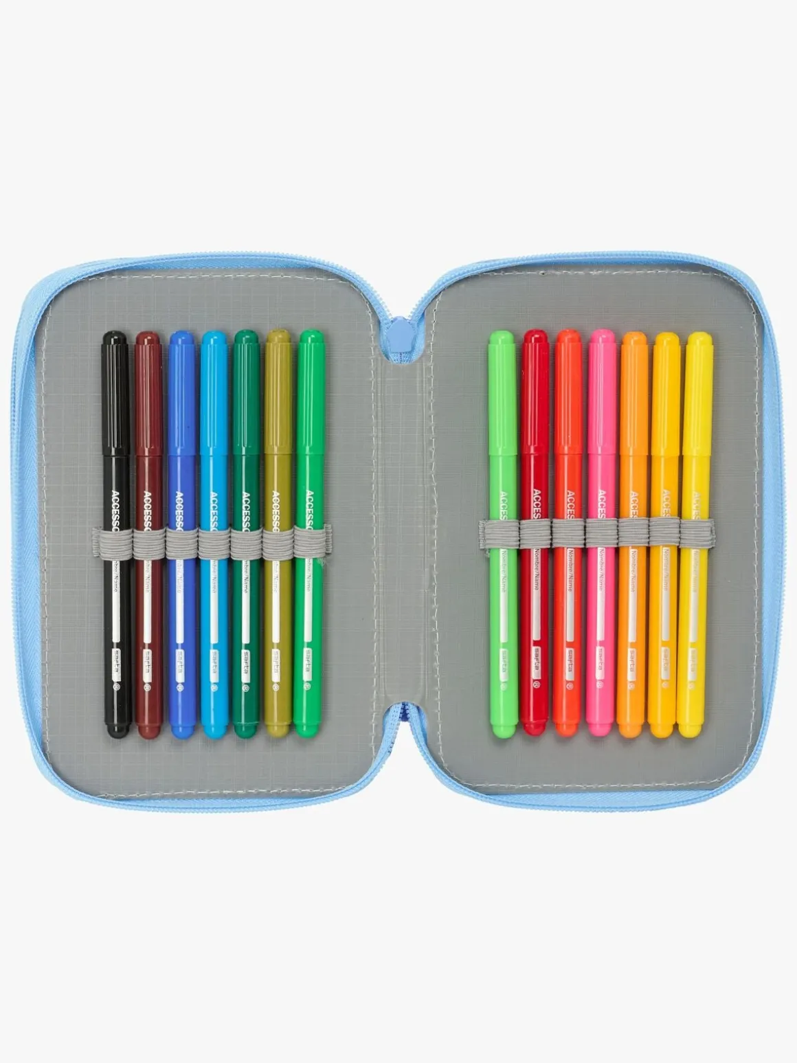 – Indeholder: 16 farveblyanter, 14 tusser, 2 kuglepenne, 2 linealer, 1 viskelæder, 1 blyant, 1 blyantspidser, 1 penalhus.
