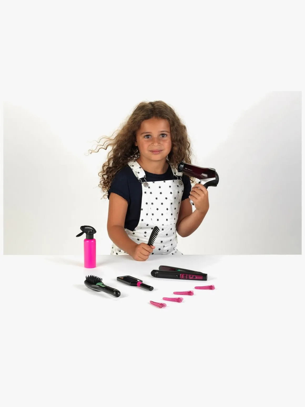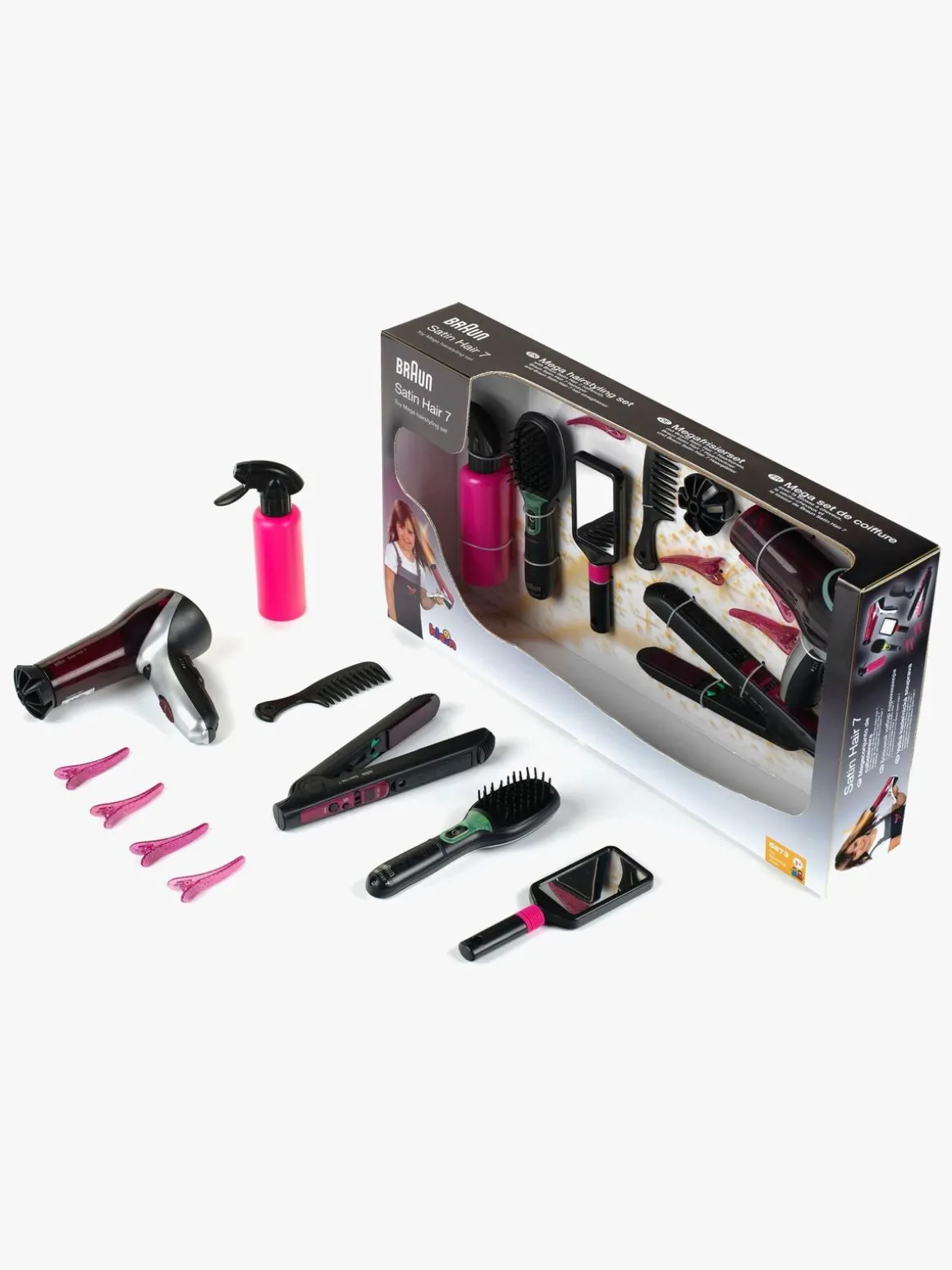 Hårtørreren og fladejernet kræver 2 stk. AAA-batterier og 1 stk. AA-batteri. Ingen af produkterne afgiver varme.