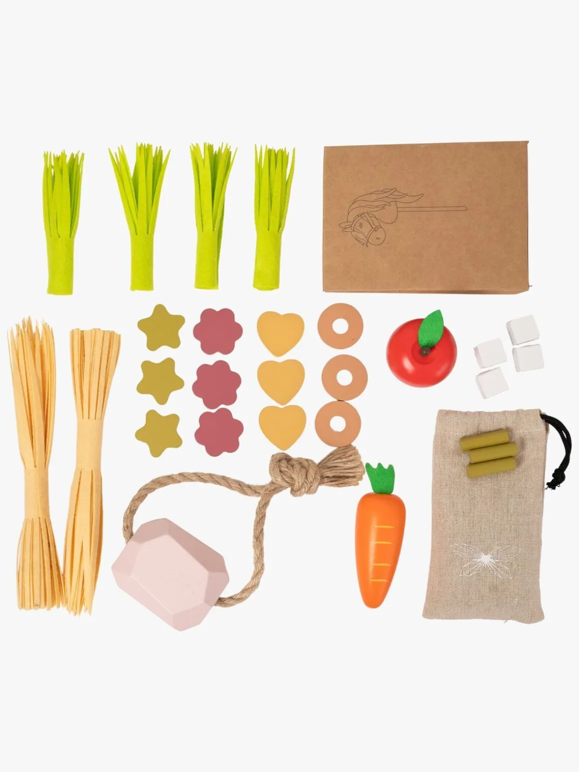 – Indeholder: 2 halmbundter, 4 Græsbundter, 1 Saltsten, 1 gulerod, 1 æble, 4 sukkerknalder, 6 hestepiller med en opbevaringspose, 12 Hestegodbidder.