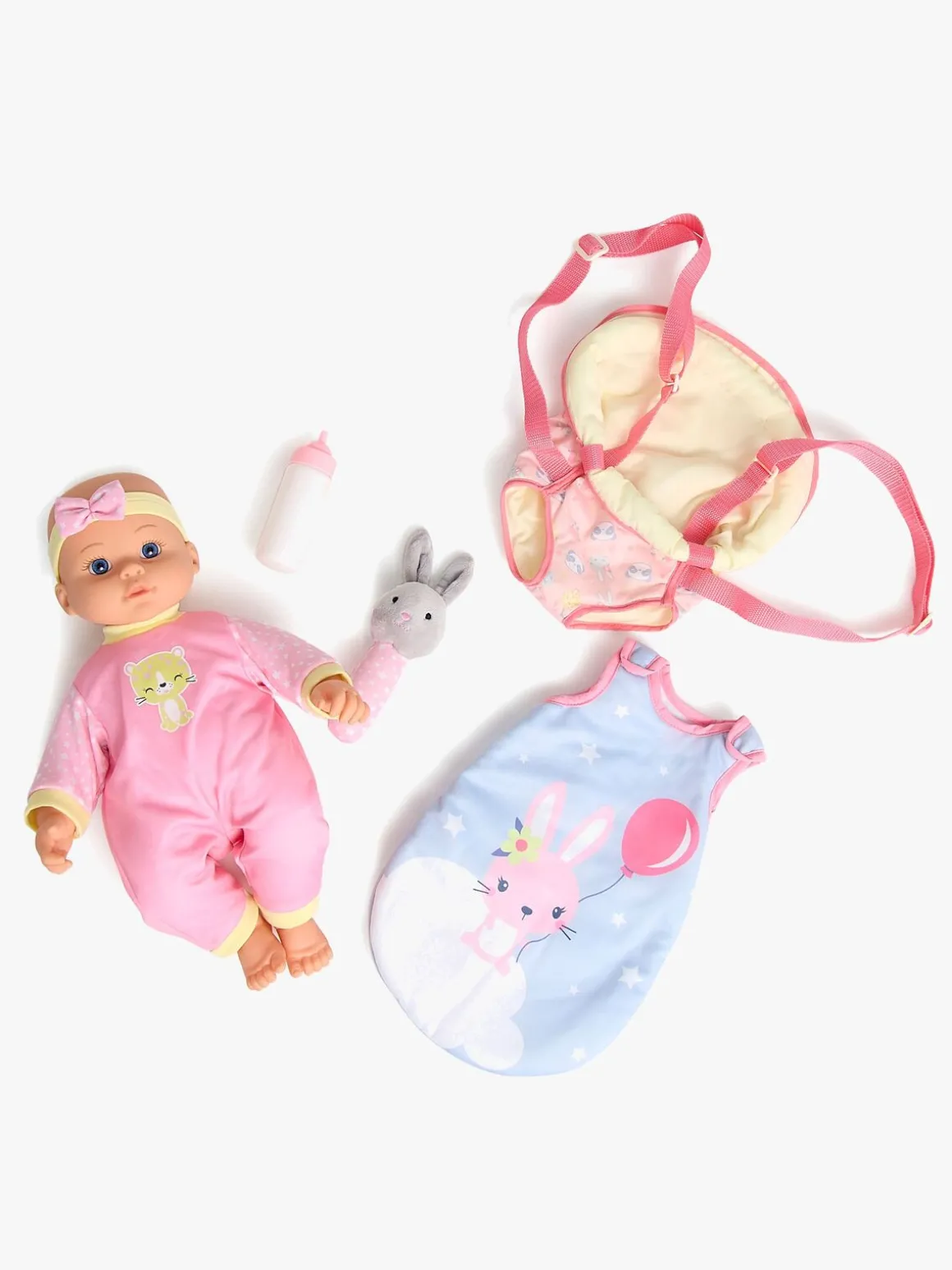 – Indeholder: 1 dukke, 1 bæresele, 1 sovepose, 1 sutteflaske, 1 bamse.