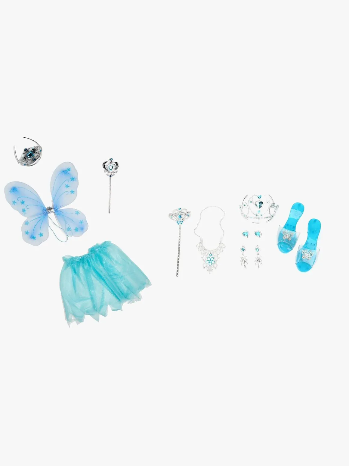 I denne pakke får du et skinnende tylskørt, fine vinger, diadem med sommerfugle og en tryllestav. Du får også en tiara og et scepter, en halskæde, øreringe og sko med sommerfugle på. Perfekt til timevis af fantasifuld leg.