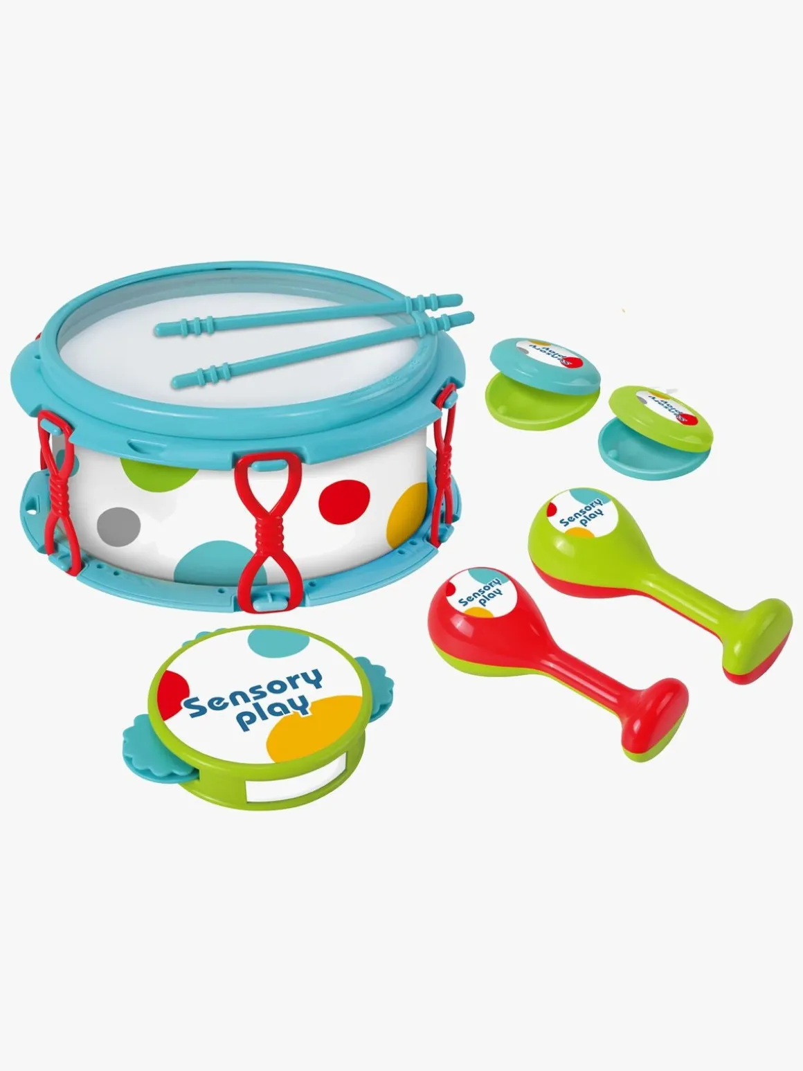 – Indeholder: 1 tromme, 2 trommestikker, 2 kastagnetter, 2 maracaer, 1 tamburin.