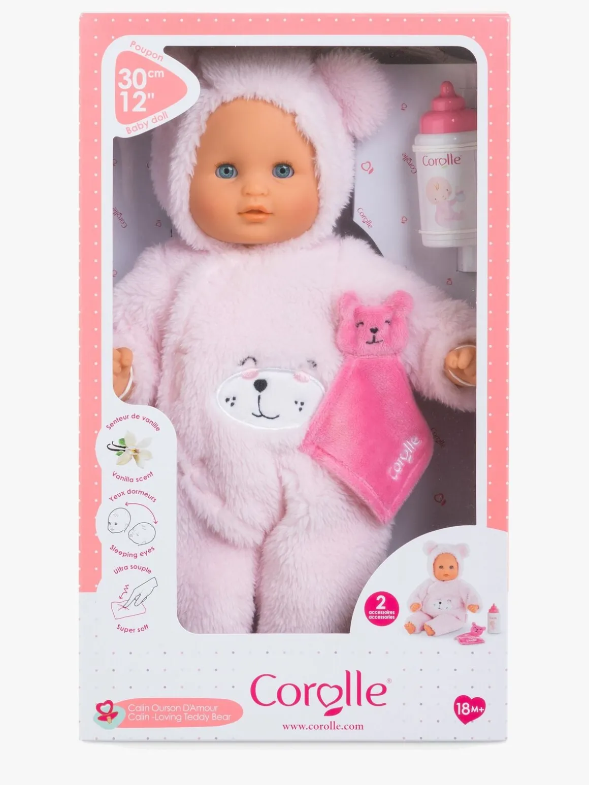 – Dukken er klædt i en lyserød, blød bamsedragt, der kan tages af.