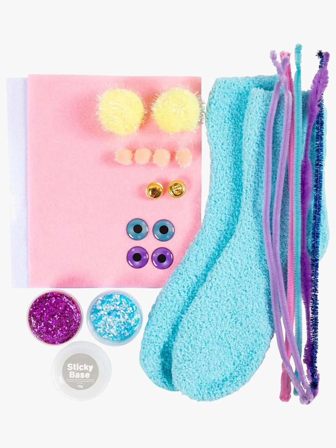 – Indeholder: sokker, filt, garnruller, bjælder, glitterler, Sticky Base, piberensere, øjne.