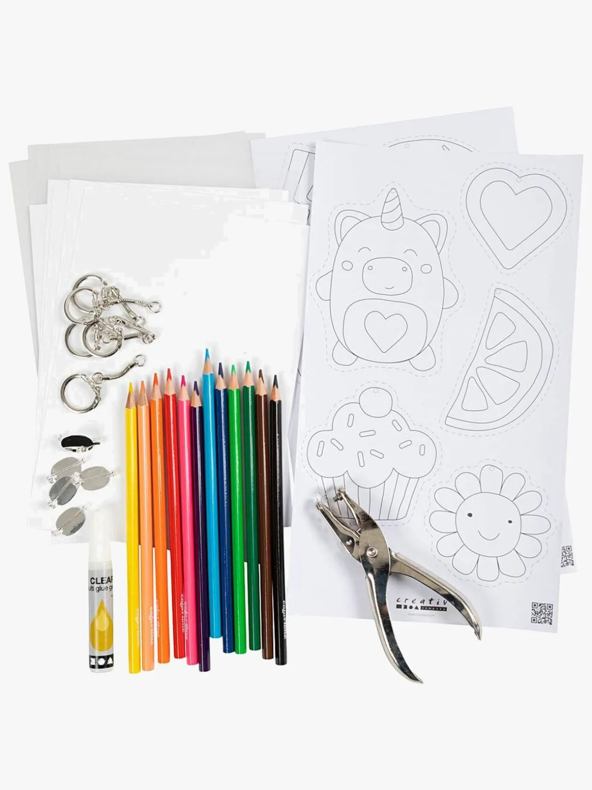 – Indeholder: krympeplastfolie, farveblyanter, nøgleringe, broche-nål, hulstempel og lim.