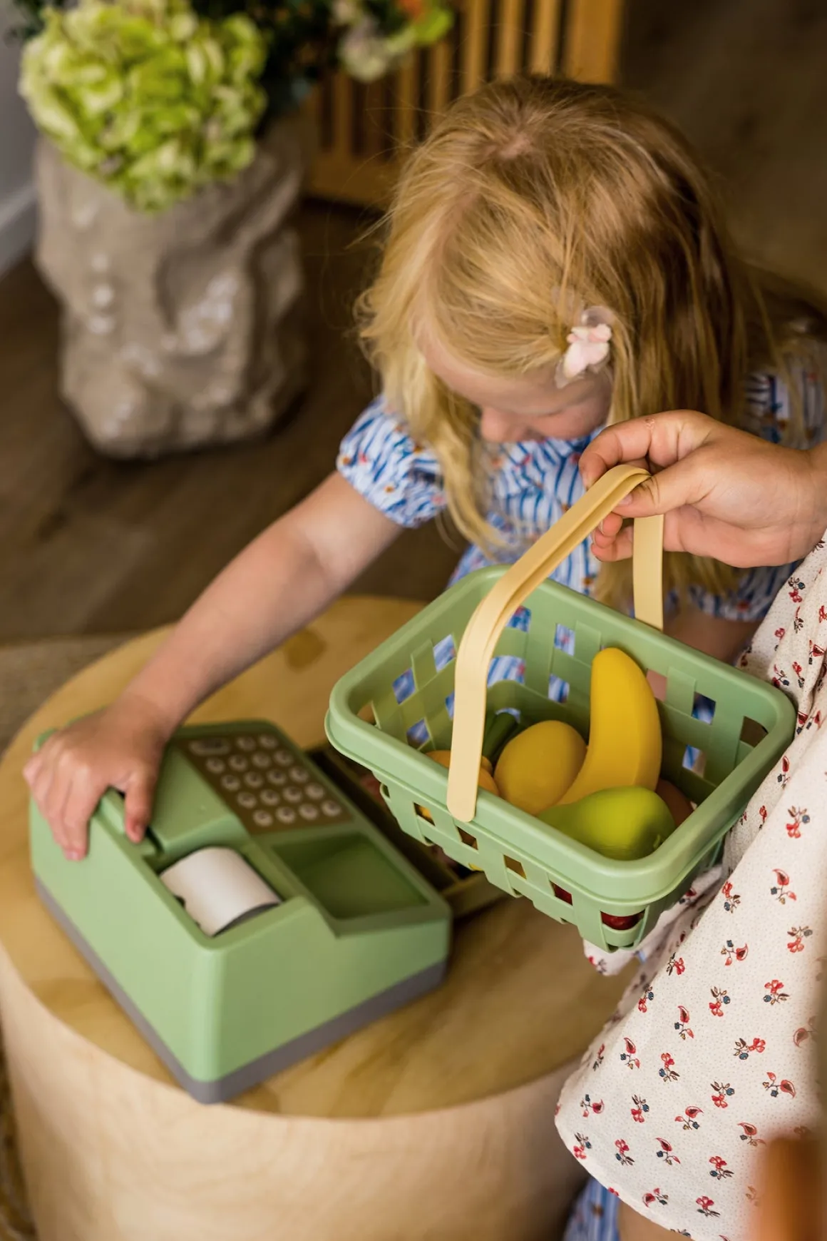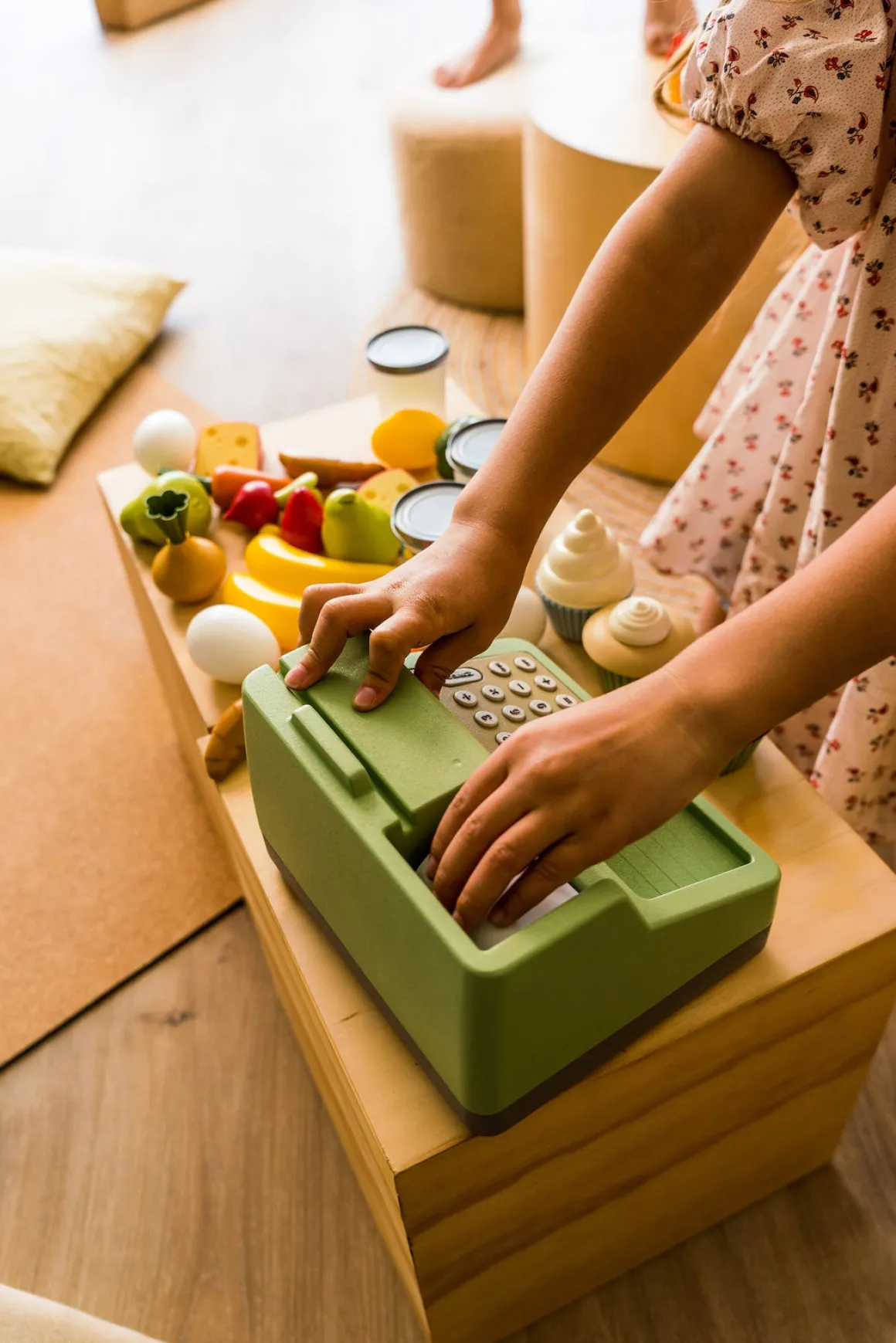 – Indeholder: kasseapparat, solcelledrevet lommeregner, papirpenge og kvitteringer.