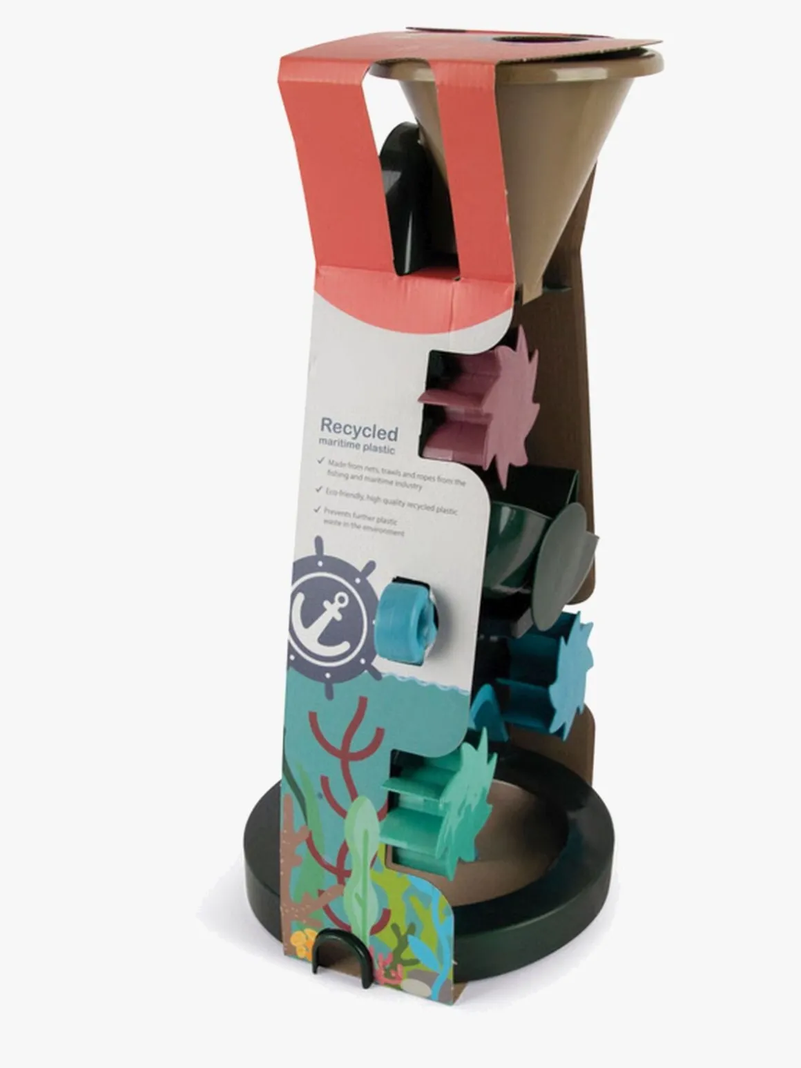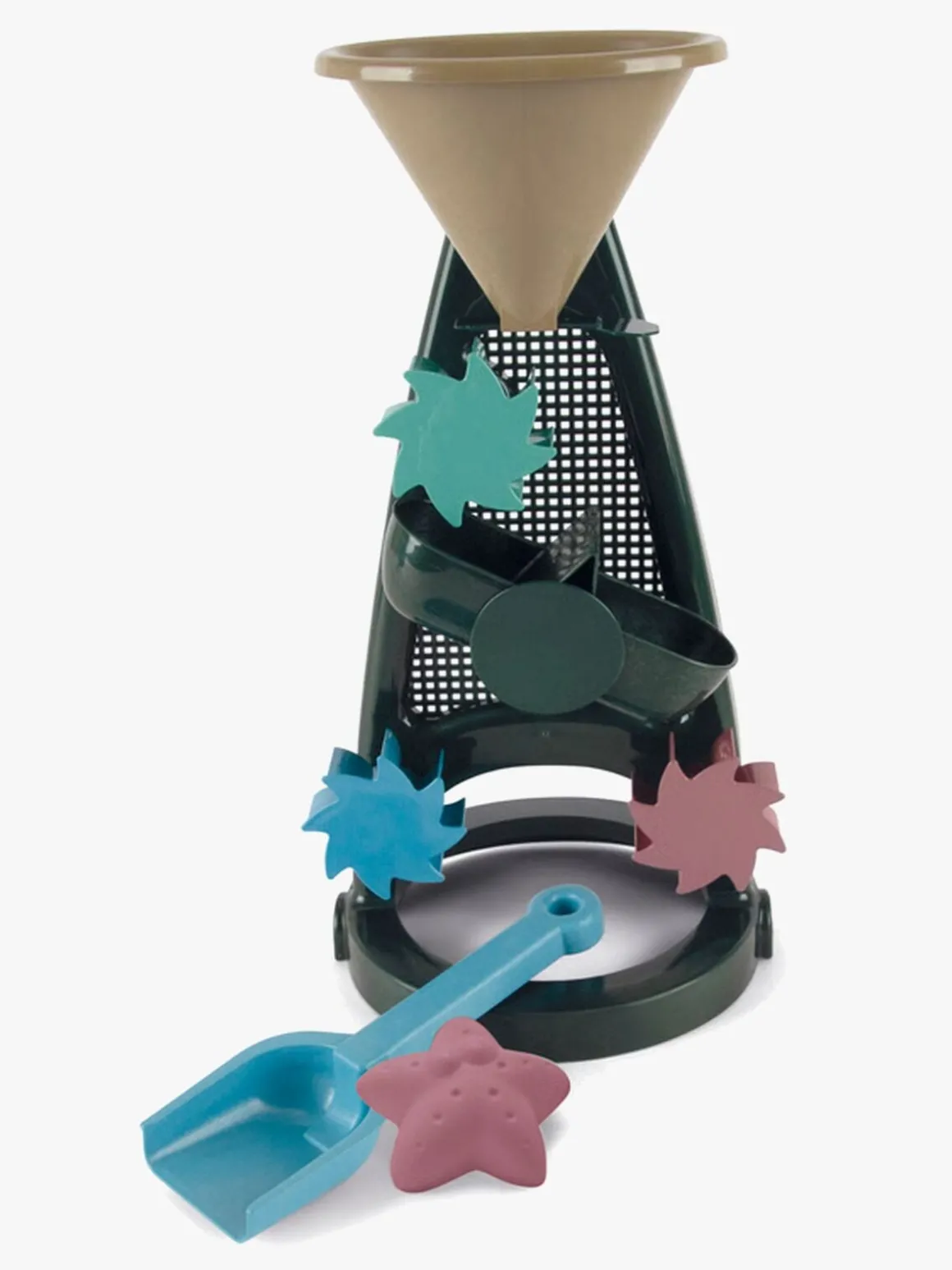 – Hæld vand eller sand i tragten for at få hjulet til at snurre!