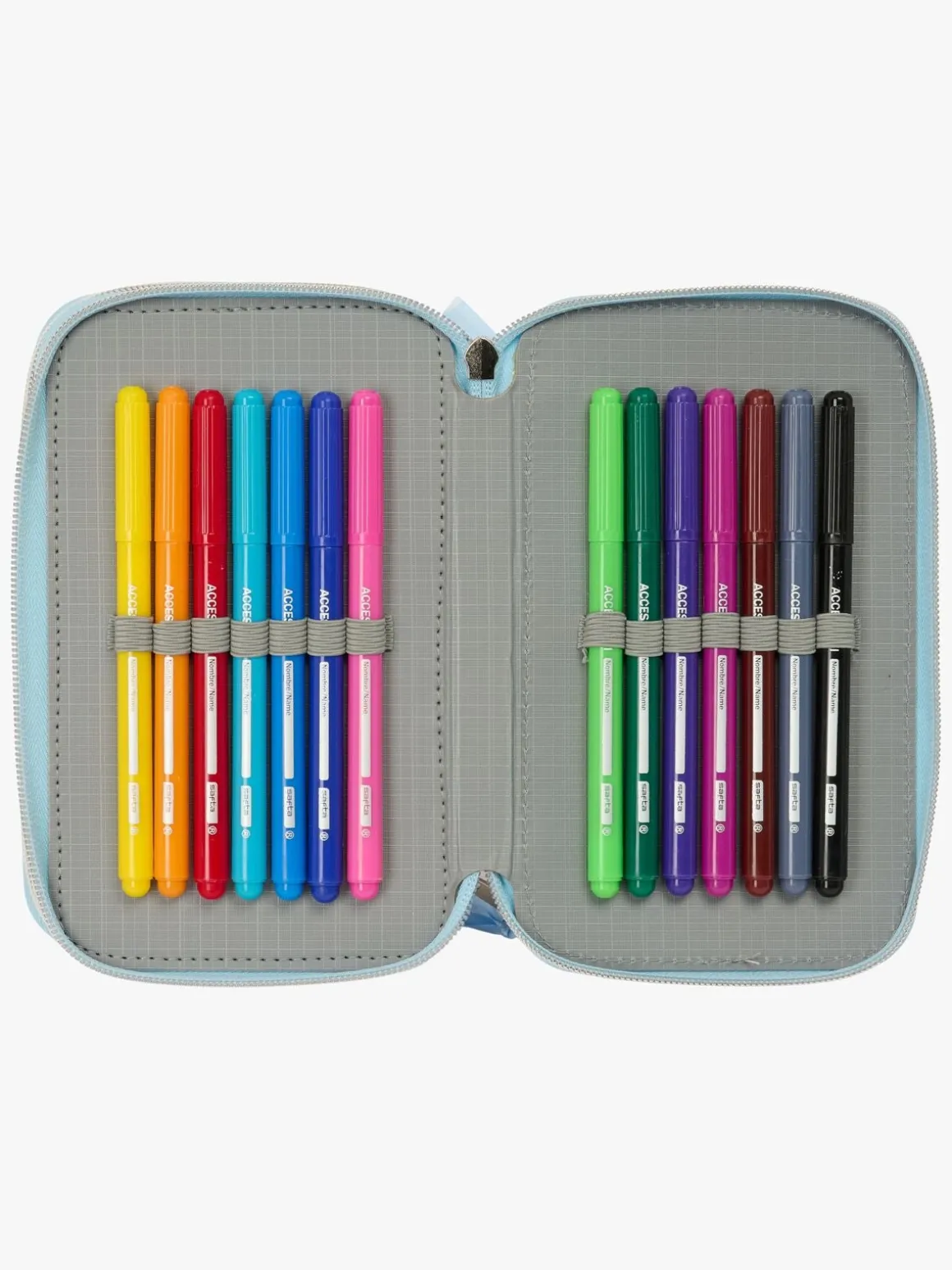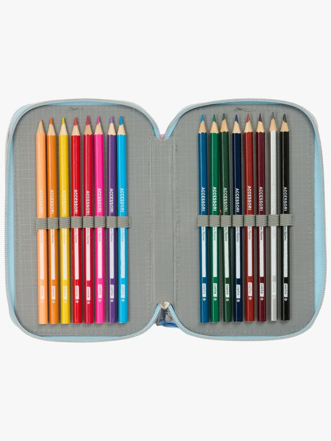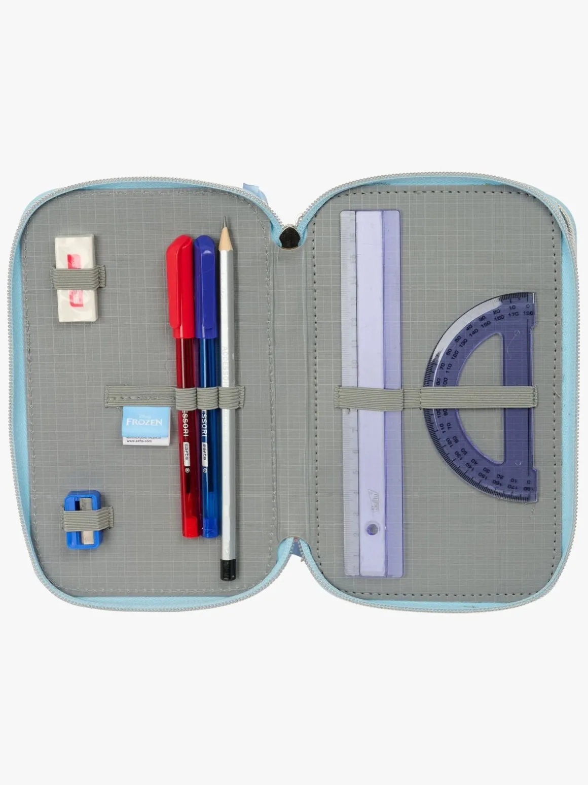 – Indeholder: 1 penalhus, 1 viskelæder, 1 blyant, 2 kuglepenne, 1 blyantspidser, 2 linealer, 16 farveblyanter, 14 tusser.