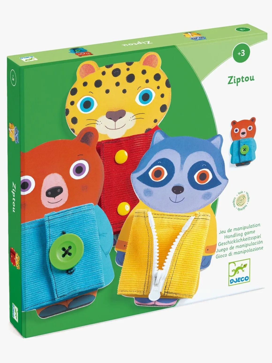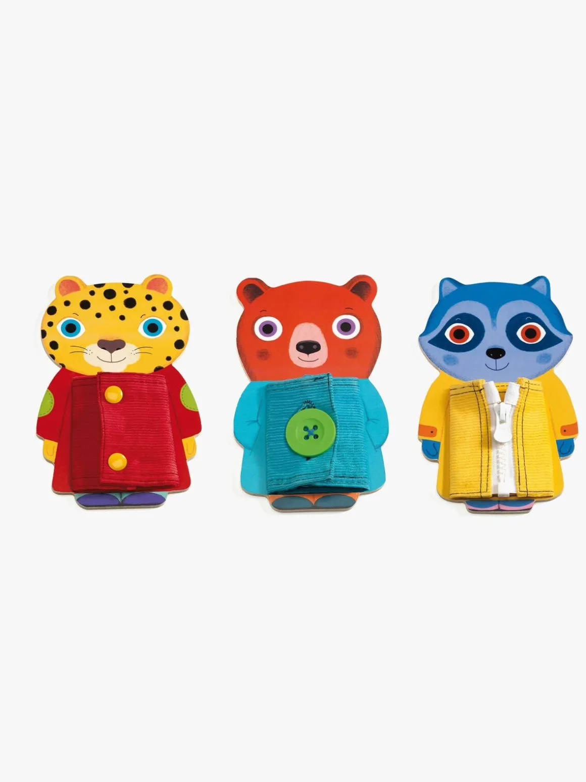 – Hjælp dyrene med at lukke deres tøj ved at knappe knapperne og lukke lynlåsen.