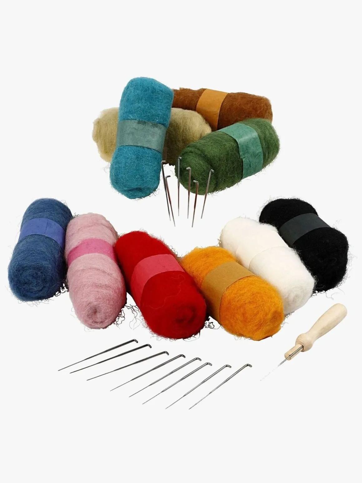 Indeholder: 10 nøgler uld på 25 g, 1 filtunderlag af skumgummi, 15 filtnåle, 1 filtnålsholder og instruktioner.