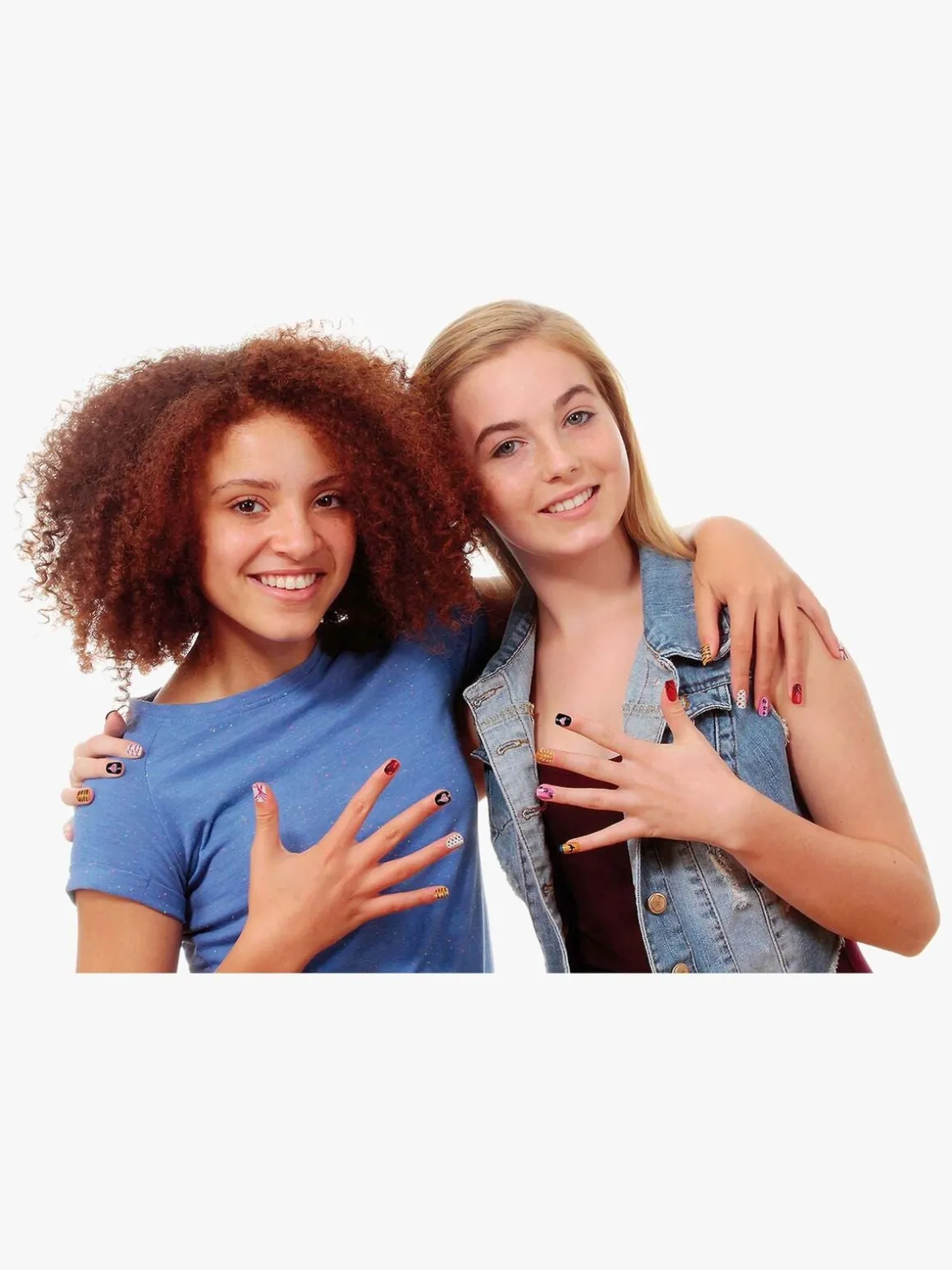 Sjovt sæt med neglelak fra FAB LAB. Med dette sæt kan du dekorere dine negle som på en rigtig salon. Farven kan derefter let skrabes af. Sættet indeholder 6 neglelak i forskellige farver, dekorationer med hjerter og stjerner, neglefil og meget mere. Dette produkt er allergitestet.
