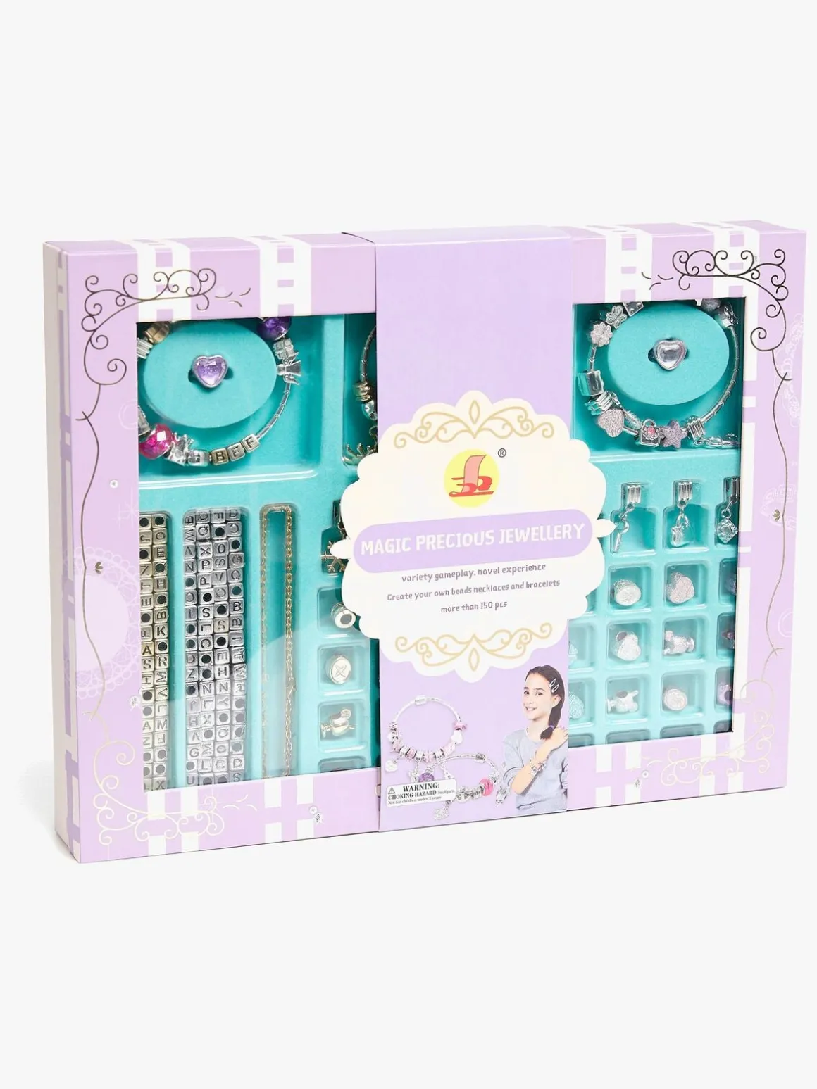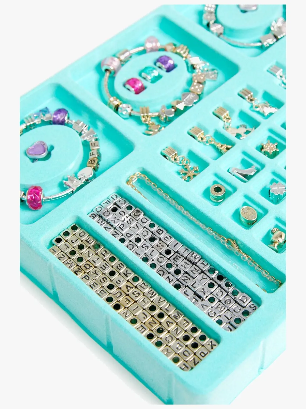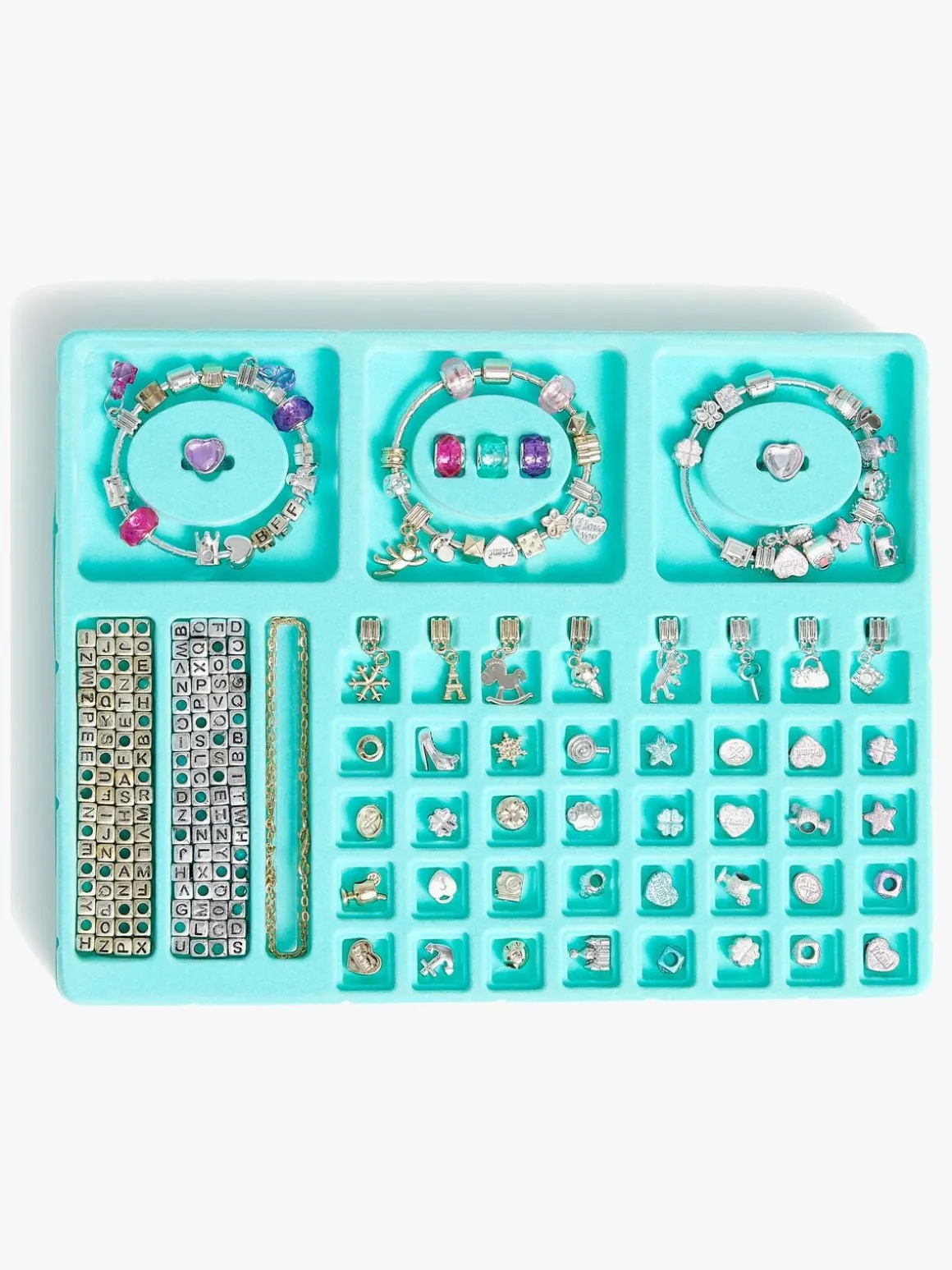 – Sættet indeholder 3 sølvarmbånd, et guldled og flere vedhæng i forskellige figurer og former.