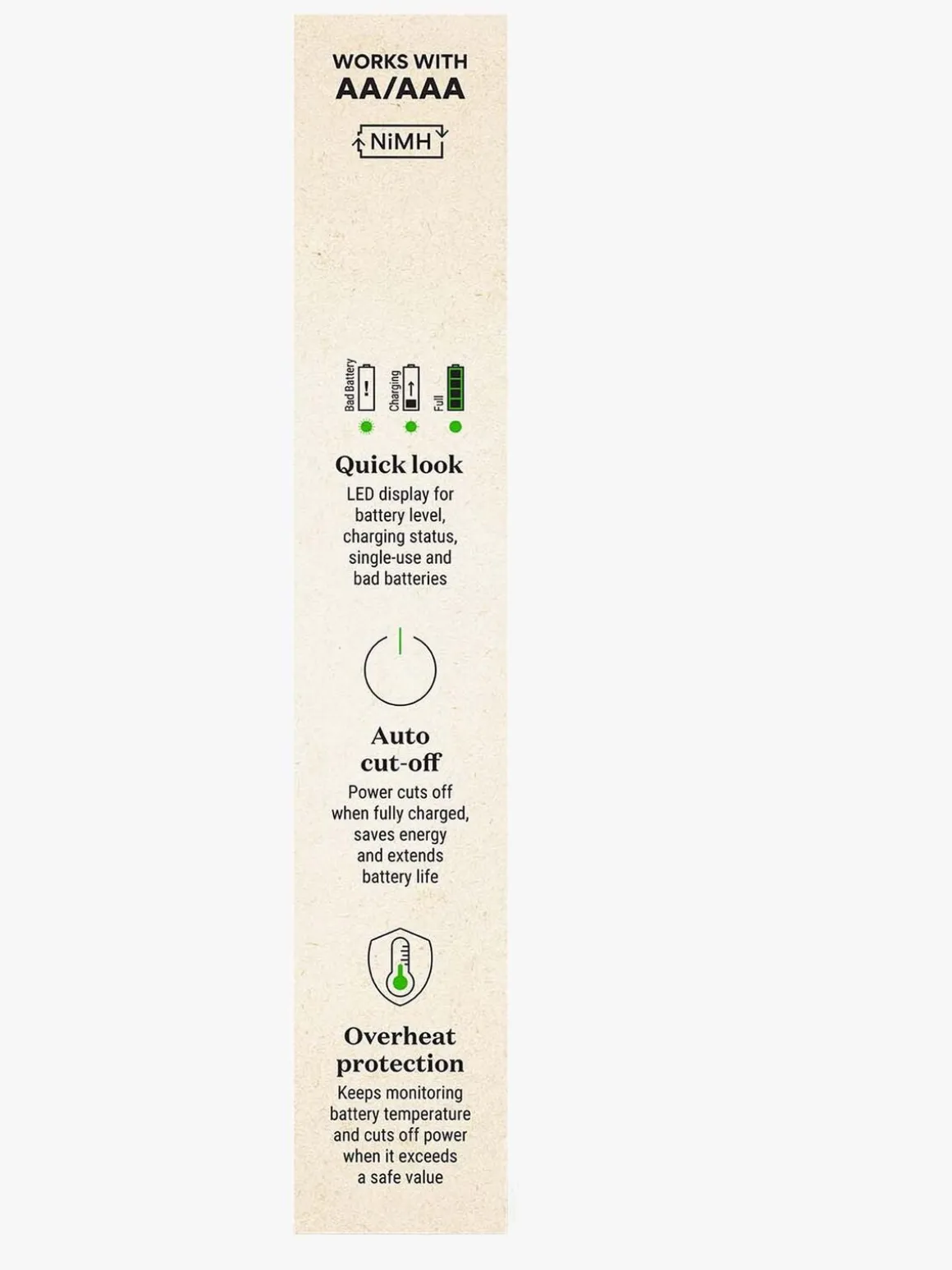 – Sikkerhedstimer, der slukker for opladeren, når batterierne er fuldt opladede. Dette forhindrer overopladning, overstrøm og kortslutning og forbedrer batteriernes levetid.