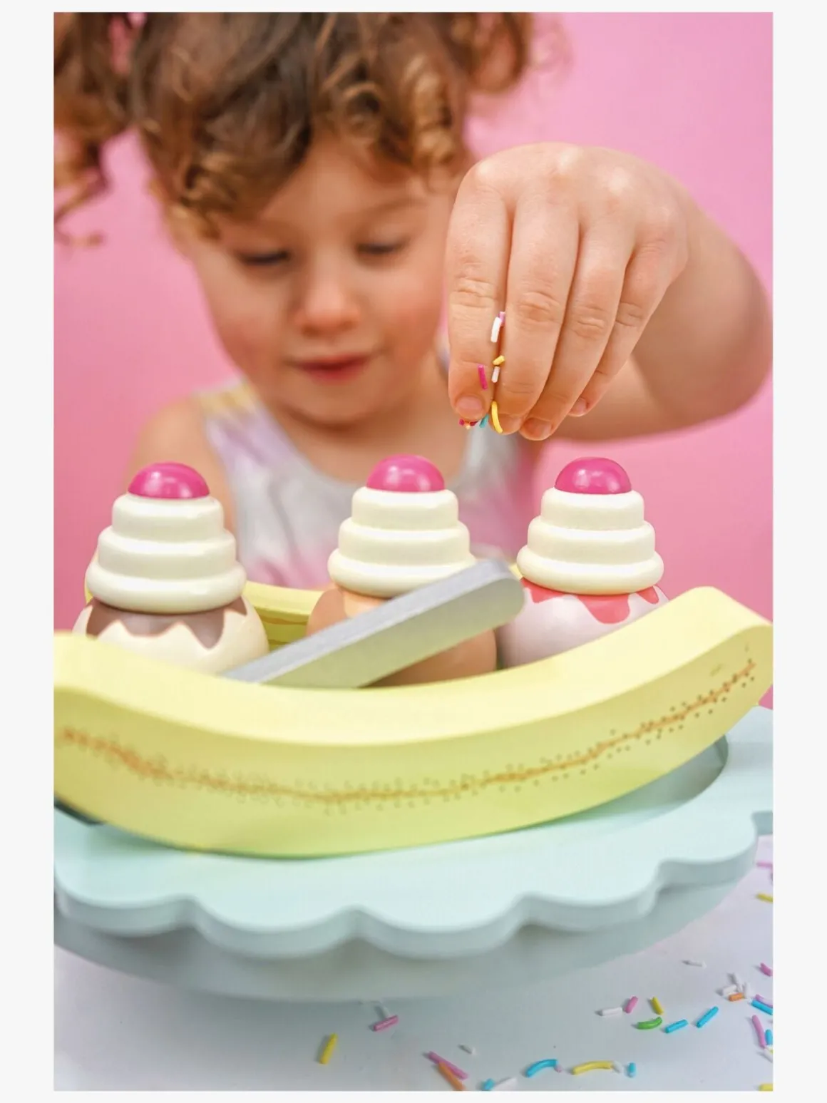 – Indeholder: 1 opskriftskort, 1 tallerken, 1 ske, 2 bananer, 3 iskugler, 3 toppe med kirsebær og flødeskum.