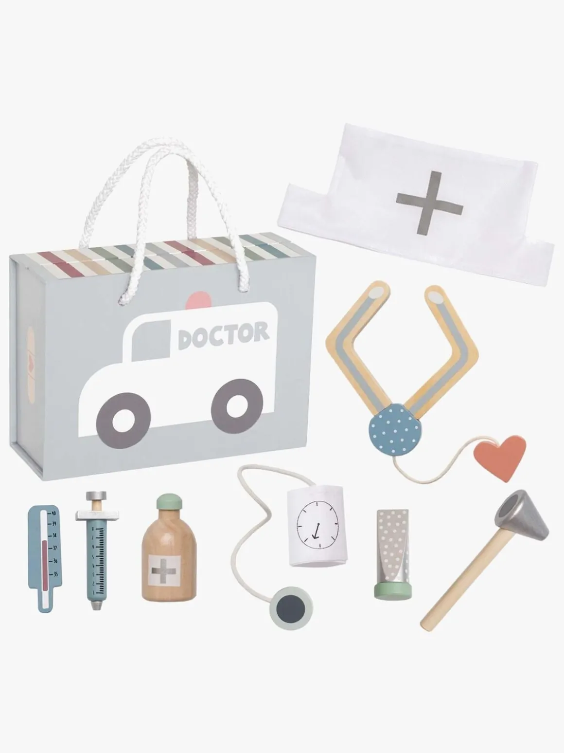 – Indeholder: 1 doktortaske, 1 doktorhat, 1 stetoskop, 1 blodtryksmåler, 1 kanyle, 1 medicinflaske, 1 otoskop, 1 dåse med salve, 1 termometer.