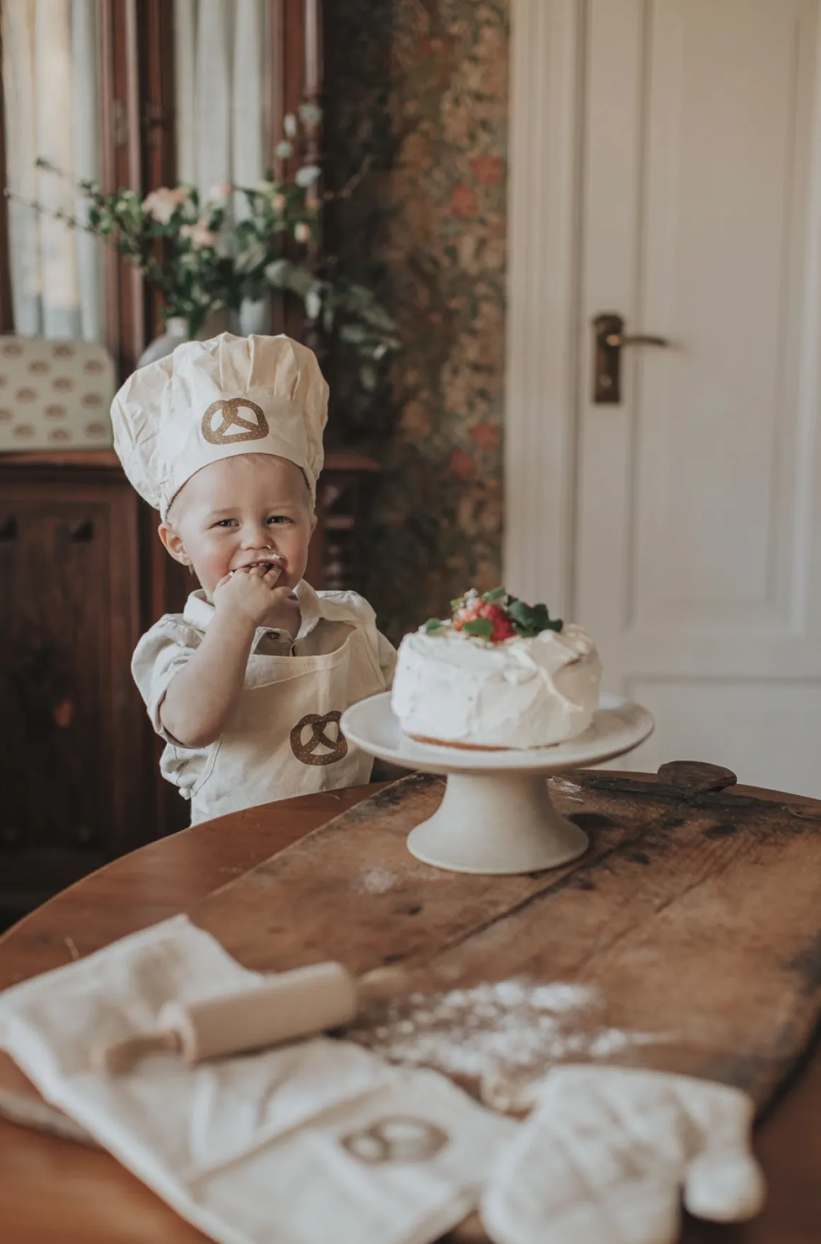 – Indeholder: 1 forklæde, 1 kokkehue, 1 ovnhandske, 1 kagerulle, 1 taske.
