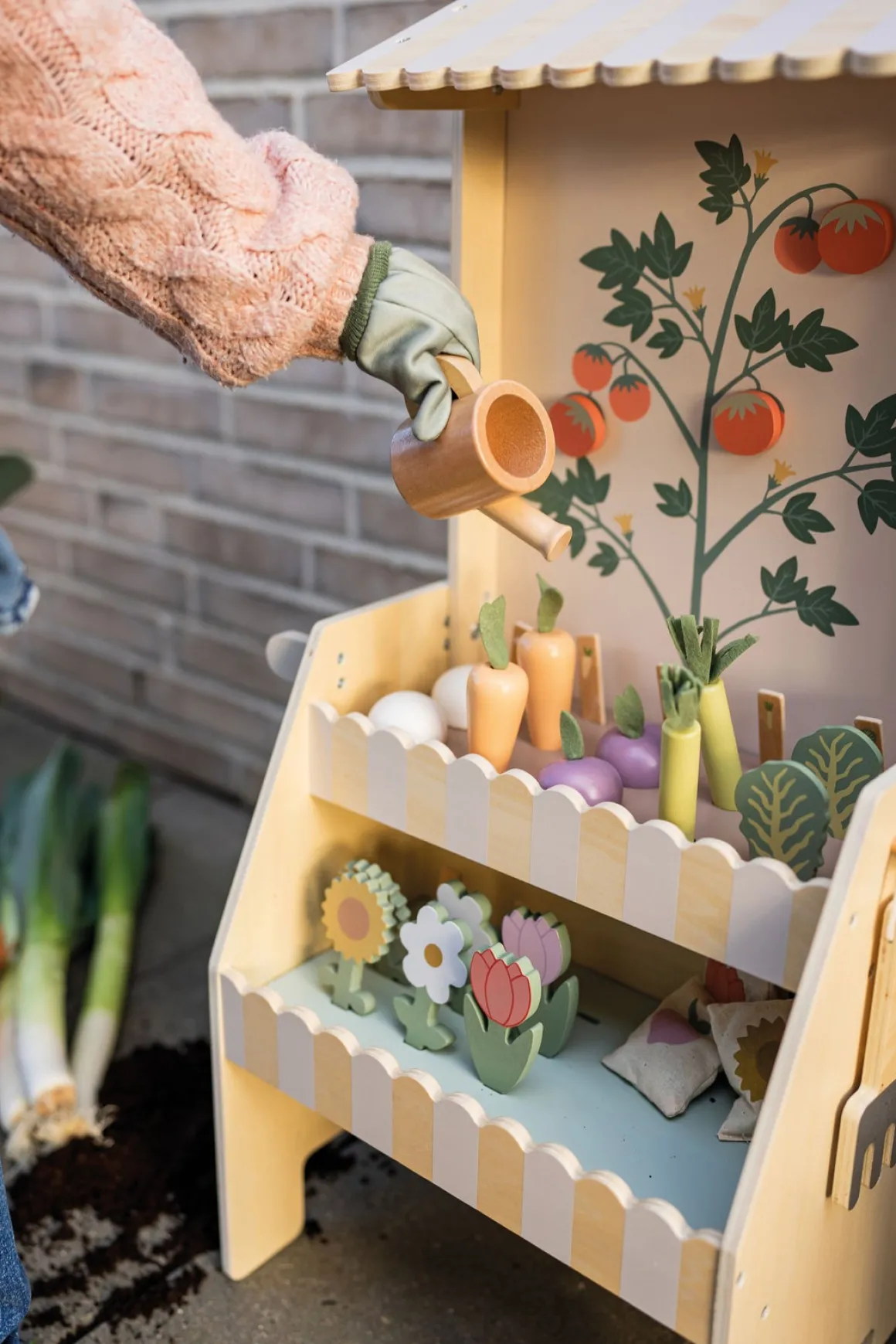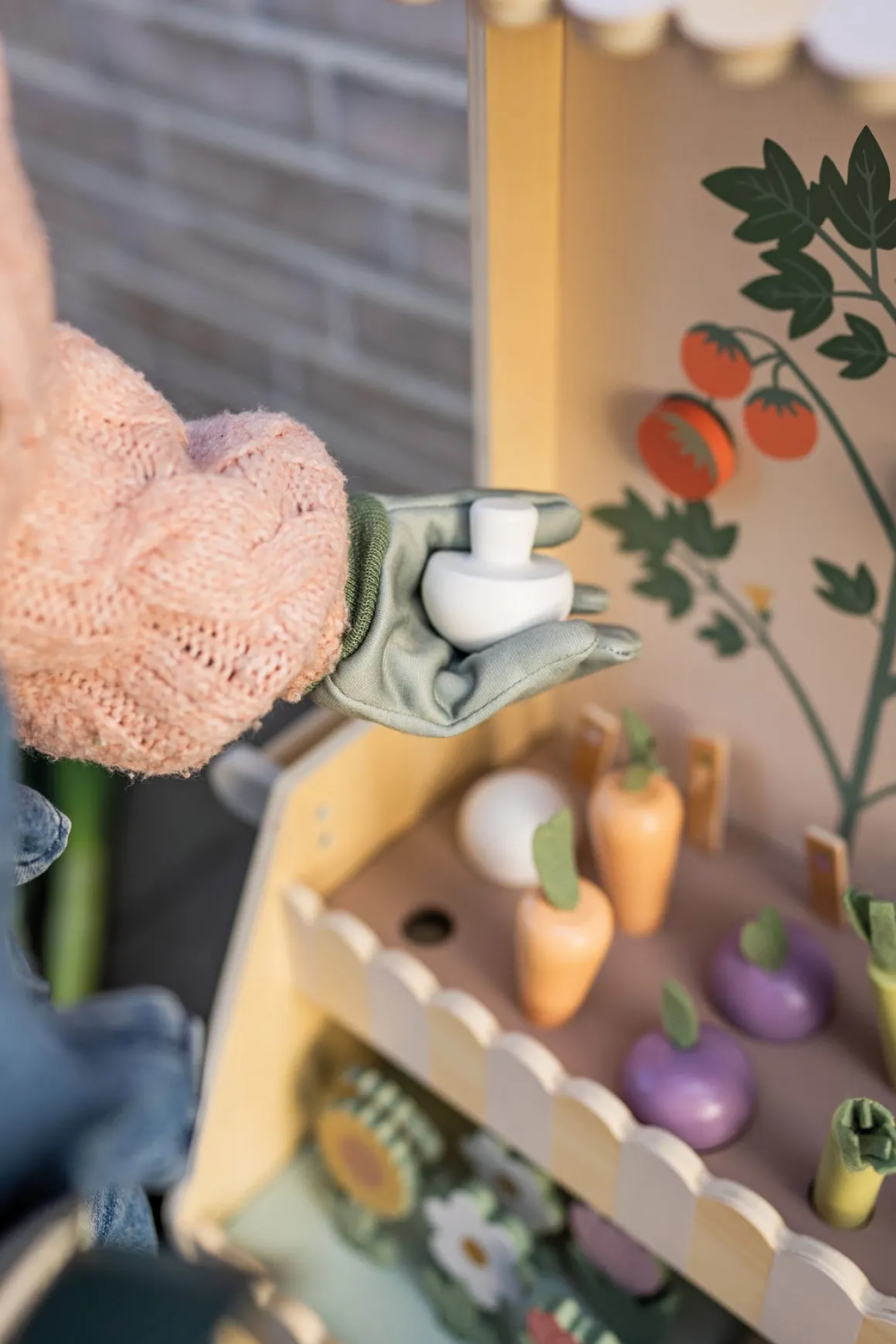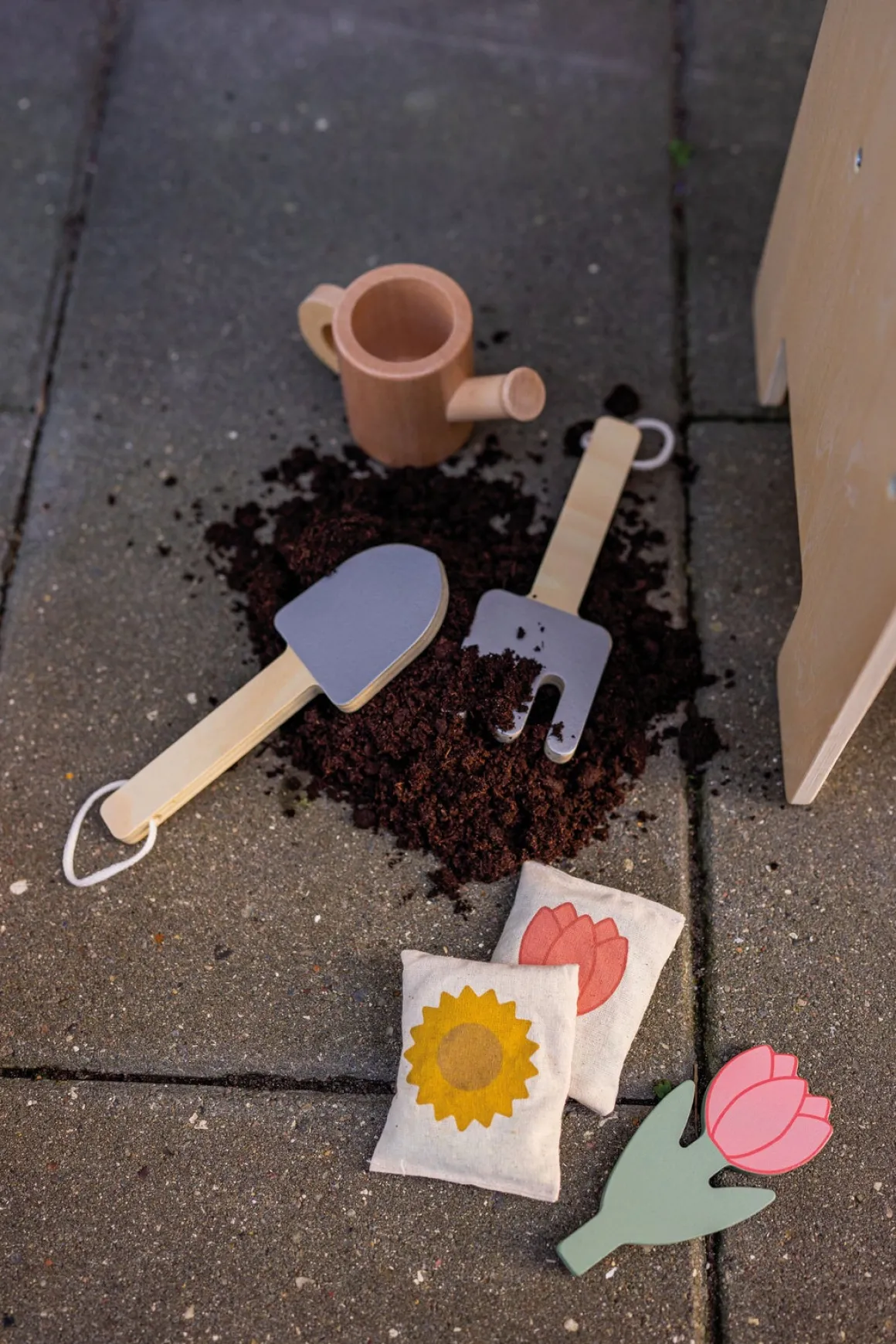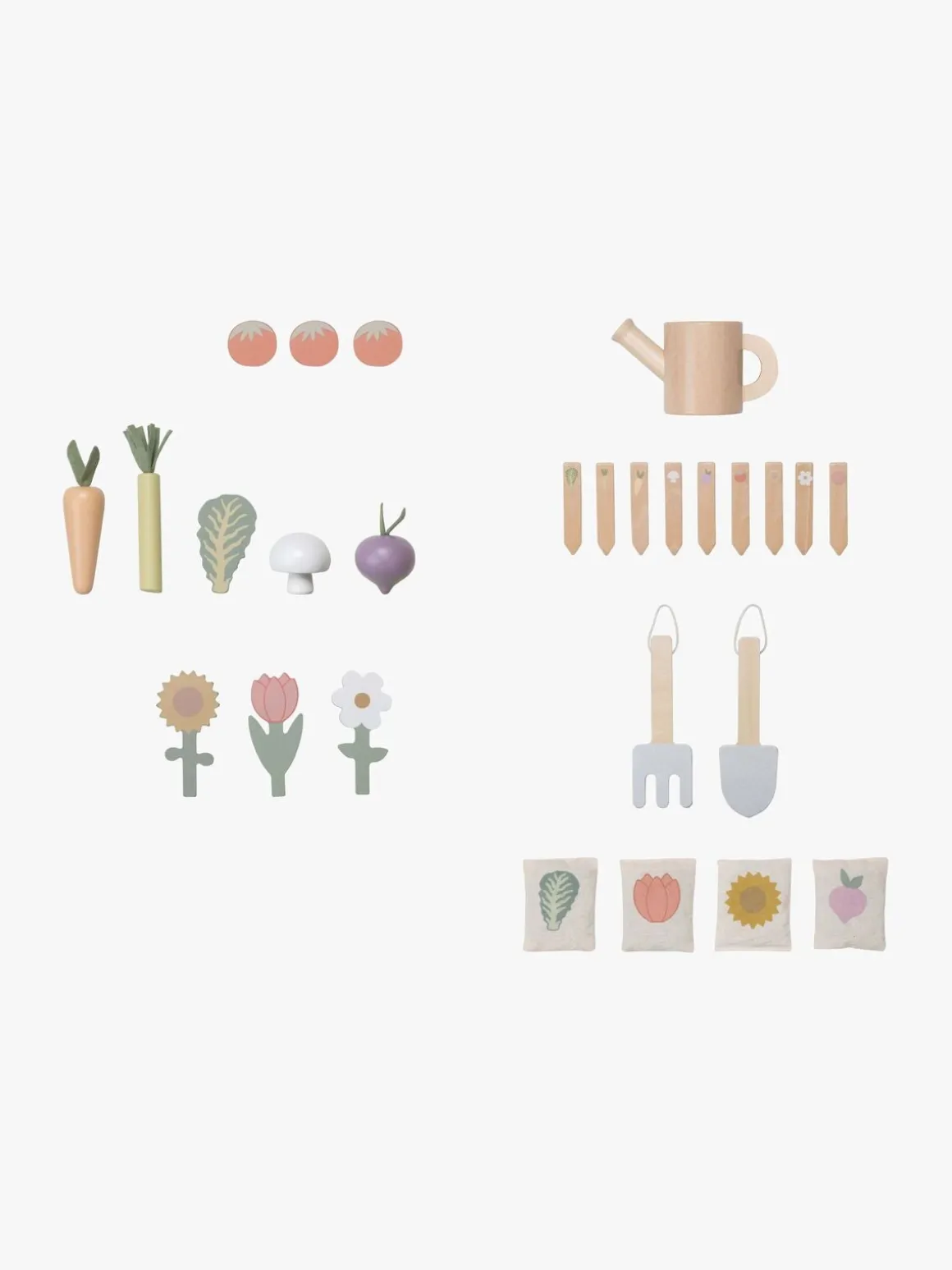 – Indeholder: 1 plantevogn, 8 plantepinde, 4 frøposer, 1 vandkande, 2 svampe, 2 gulerødder, 2 radiser, 2 tulipaner, 2 solsikker, 1 rive, 1 spade, 2 kål, 2 porrer.