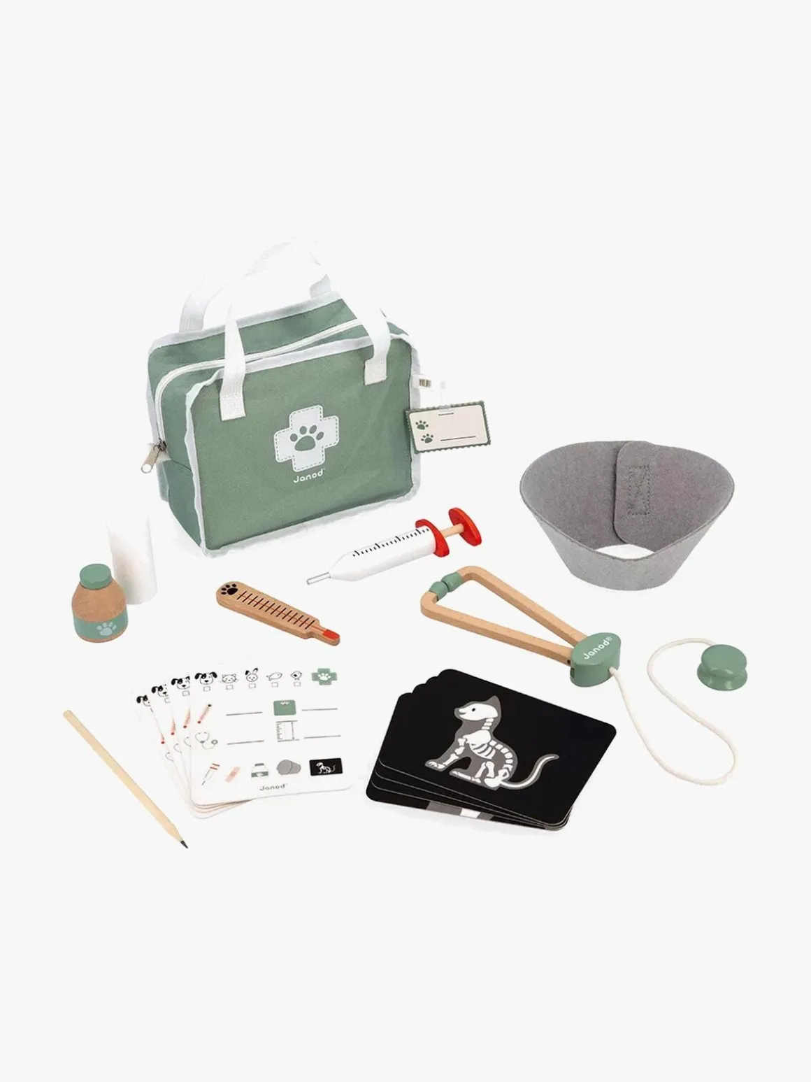 – Indeholder: 1 skilt, 4 receptkort, 4 røntgenbilleder, 1 pen, 1 bandage, 1 filtkrave, 1 stetoskop, 1 sprøjte, 1 termometer og 1 bøtte med salve.