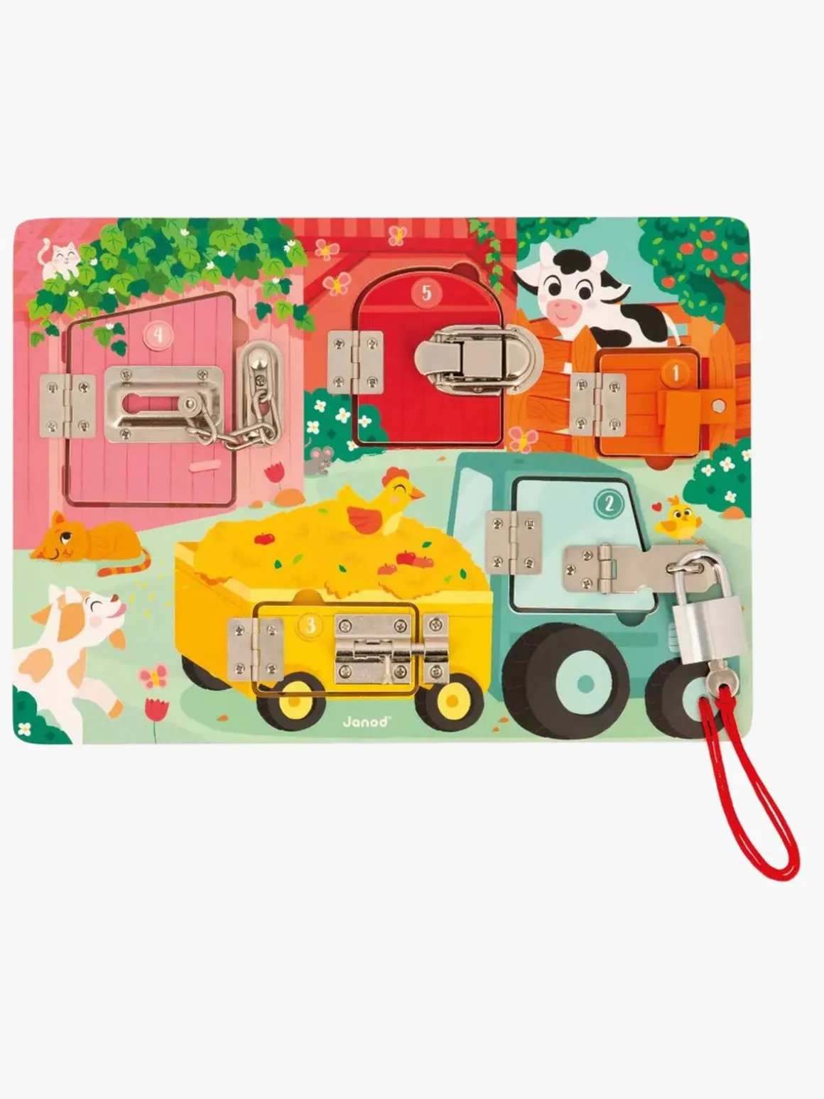 – Nøgle, haspe, dørkæde, spænde og lås.