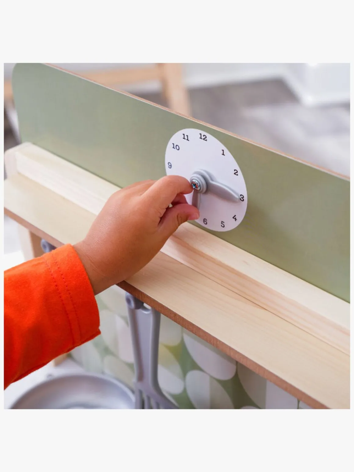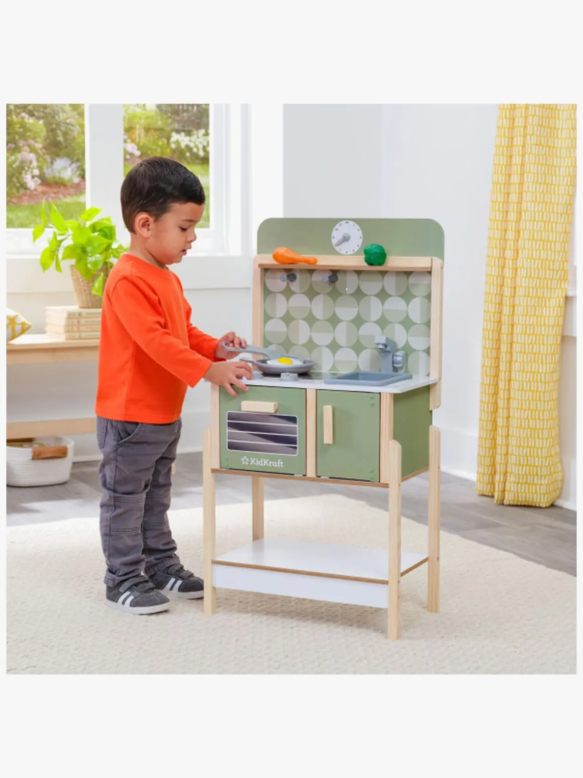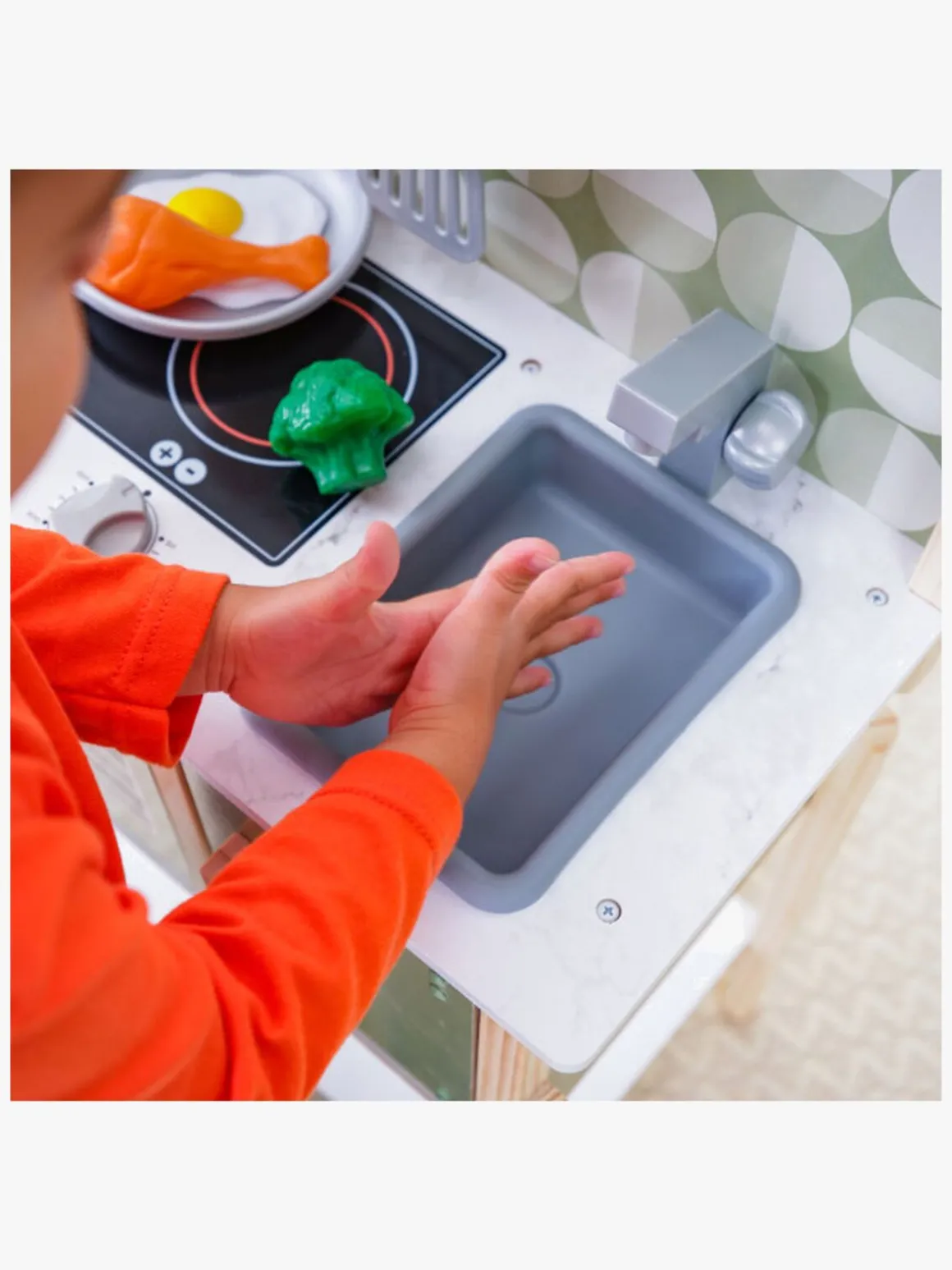– Indeholder: et legekøkken, legemad (kyllingelår, broccoli og æg), en stegepande og en spatel.
