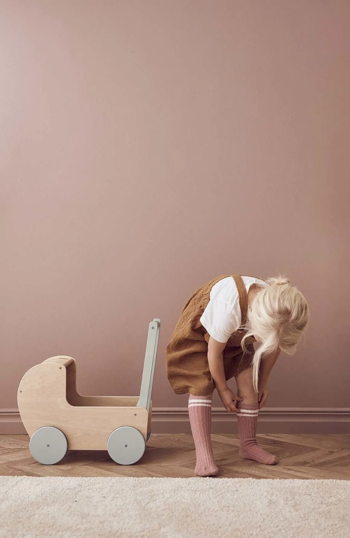 | Materiale | Dukkevogn: Krydsfiner af lind og bøg Håndtag: Fyrretræ, Schima Hjul: MDF Tekstil: 100 % bomuld. Polstring pude: 100 % polyester. |