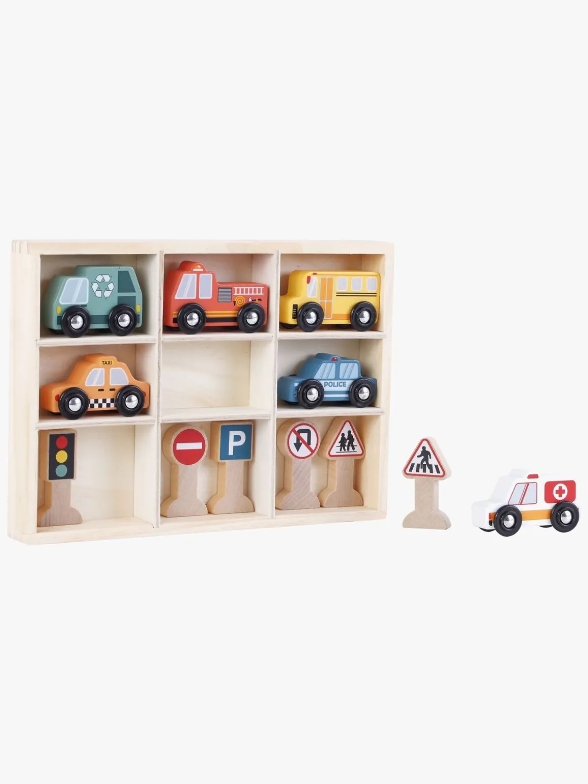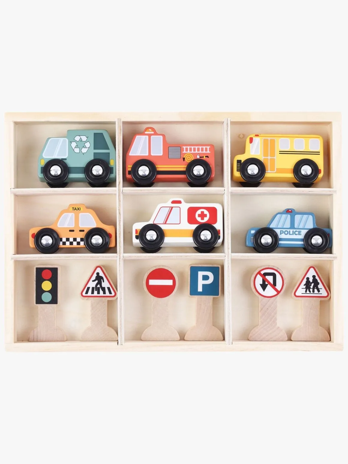 – Indeholder: en skraldevogn, en brandbil, en skolebus, en taxa, en ambulance, en politibil og 6 trafikskilte.