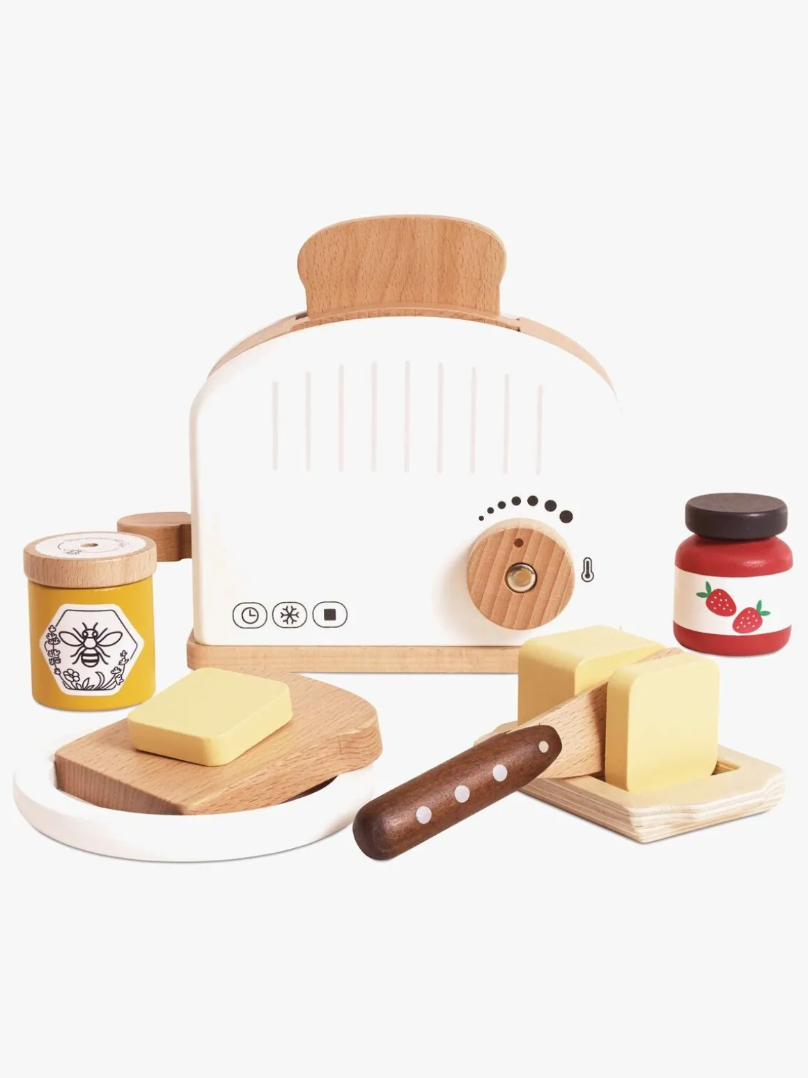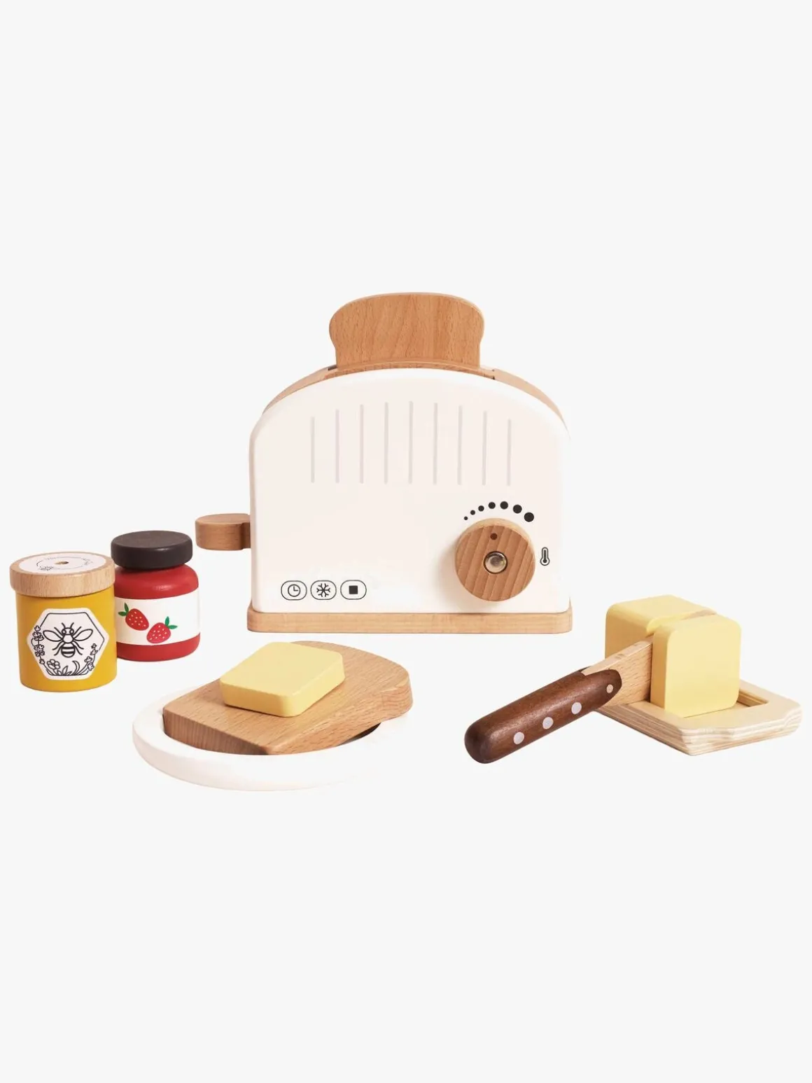 – Indeholder: 1 brødrister i træ, 2 brødskiver, 1 brik med smør, 1 skål, 1 honningkrukke, 1 bøtte med jordbærsyltetøj, 1 trækniv, 1 tallerken.