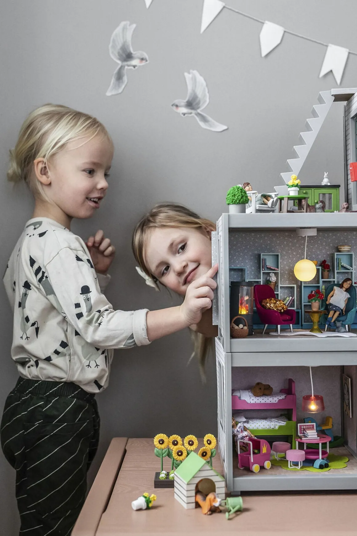 Modulet har vendbare vægge med smukke tapeter fra Sandberg Wallpaper. Du kan desuden tage væggene væk, så du kan lege fra begge sider.