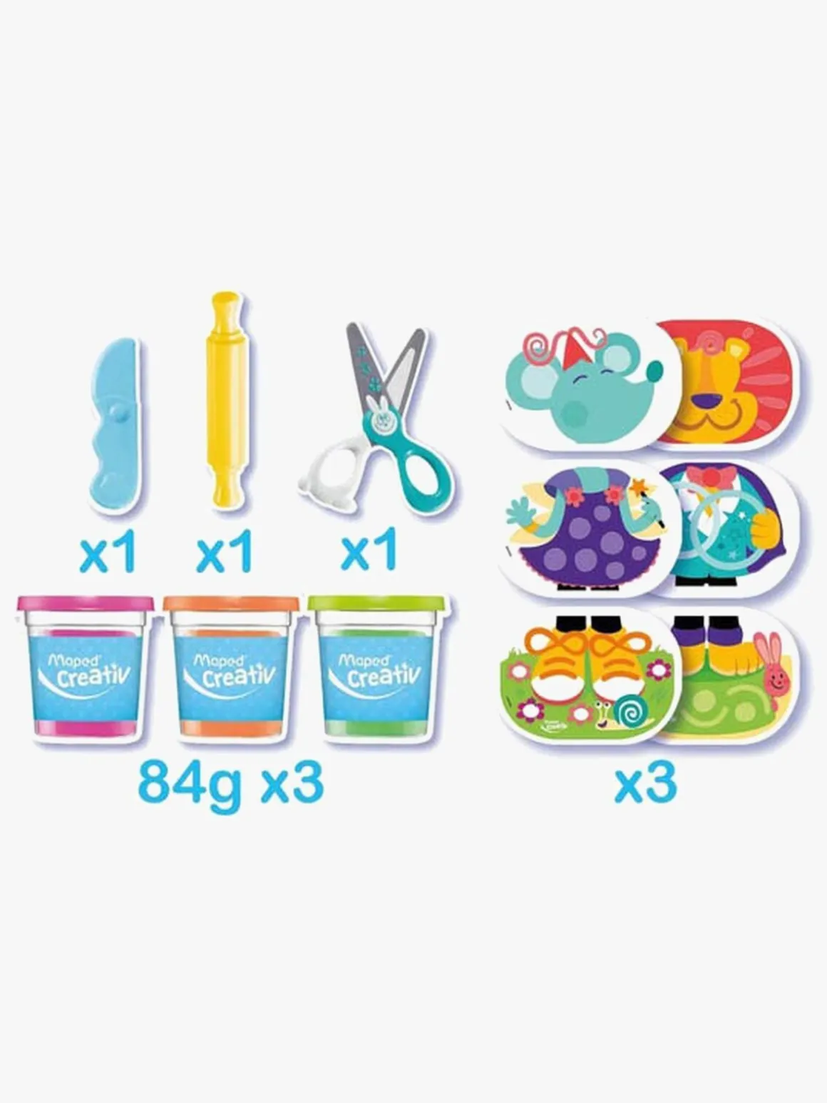 Sjovt modellervokssæt fra Maped med modellervoks i tre forskellige farver. Det har meget tilbehør og indeholder alt det, dit barn skal bruge til at skabe kreationer ud af modellervoks.