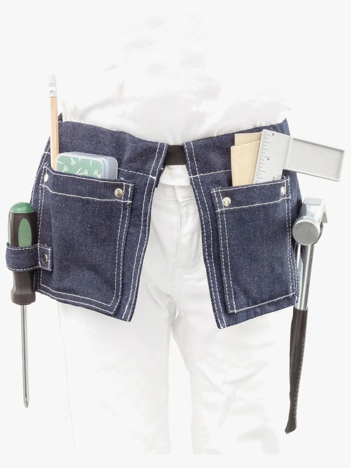 Med bæltet får du: hammer, skruetrækker, vinkelmåler, blyant, sandpapir og en pakke med søm og skruer.