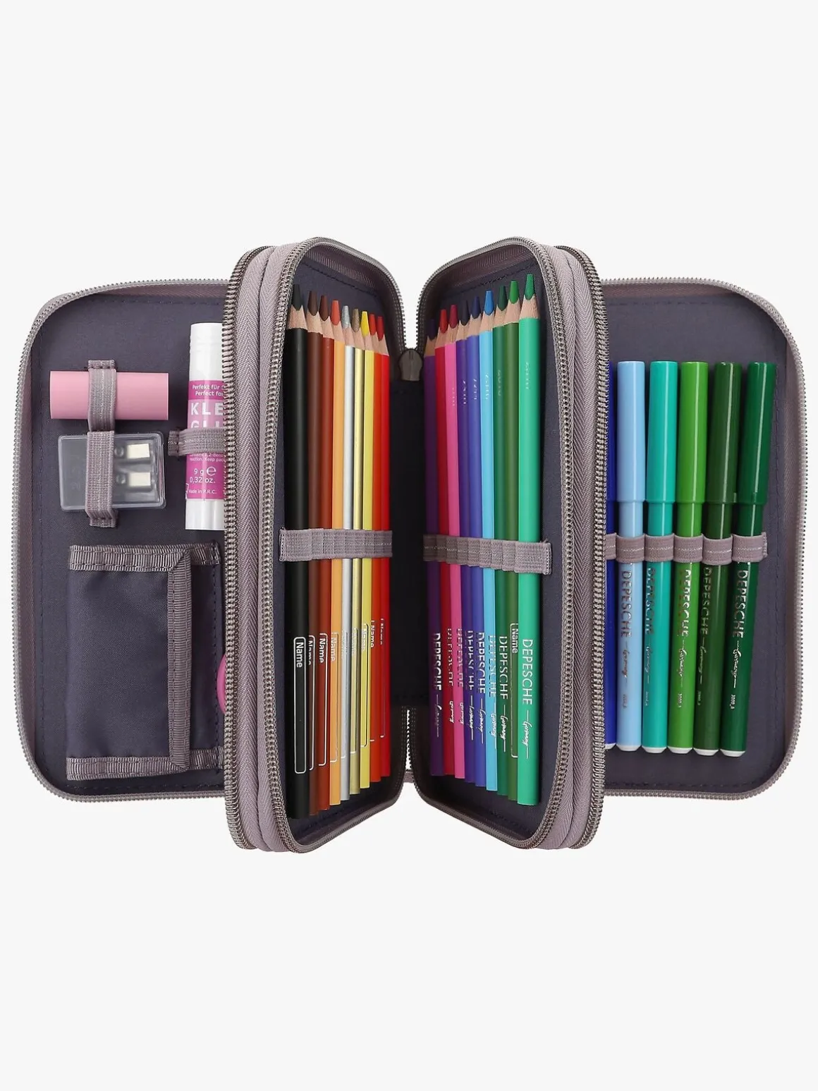 – Indeholder: 1 penalhus, 18 farveblyanter, 18 tusser, 2 blyanter, 1 saks, 1 limstift, 1 blyantspidser, 1 lineal, 1 viskelæder.