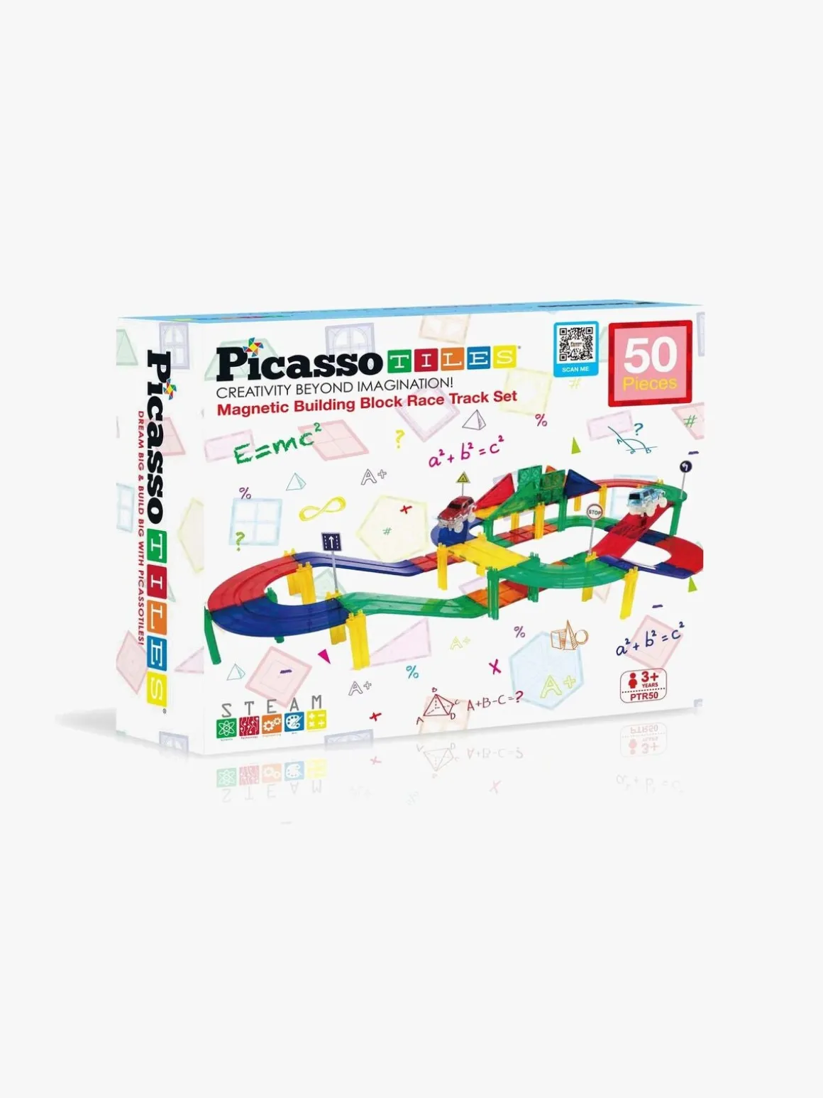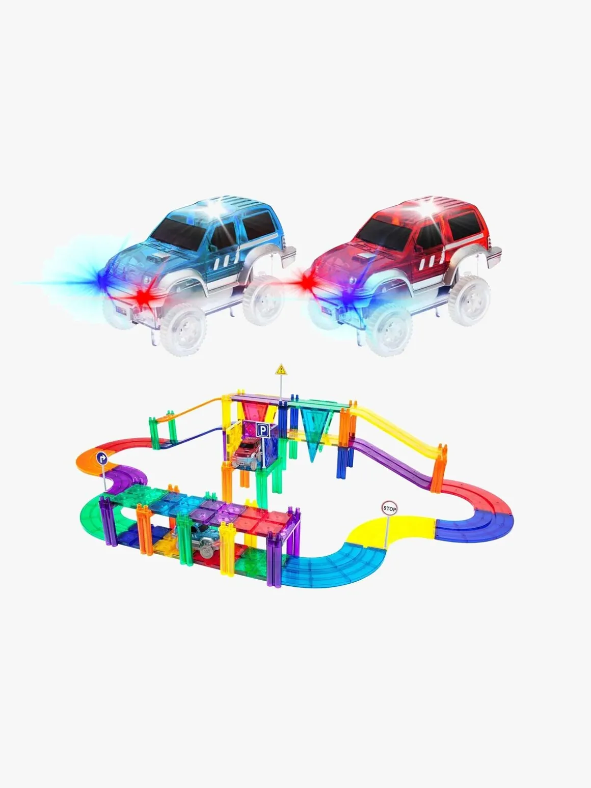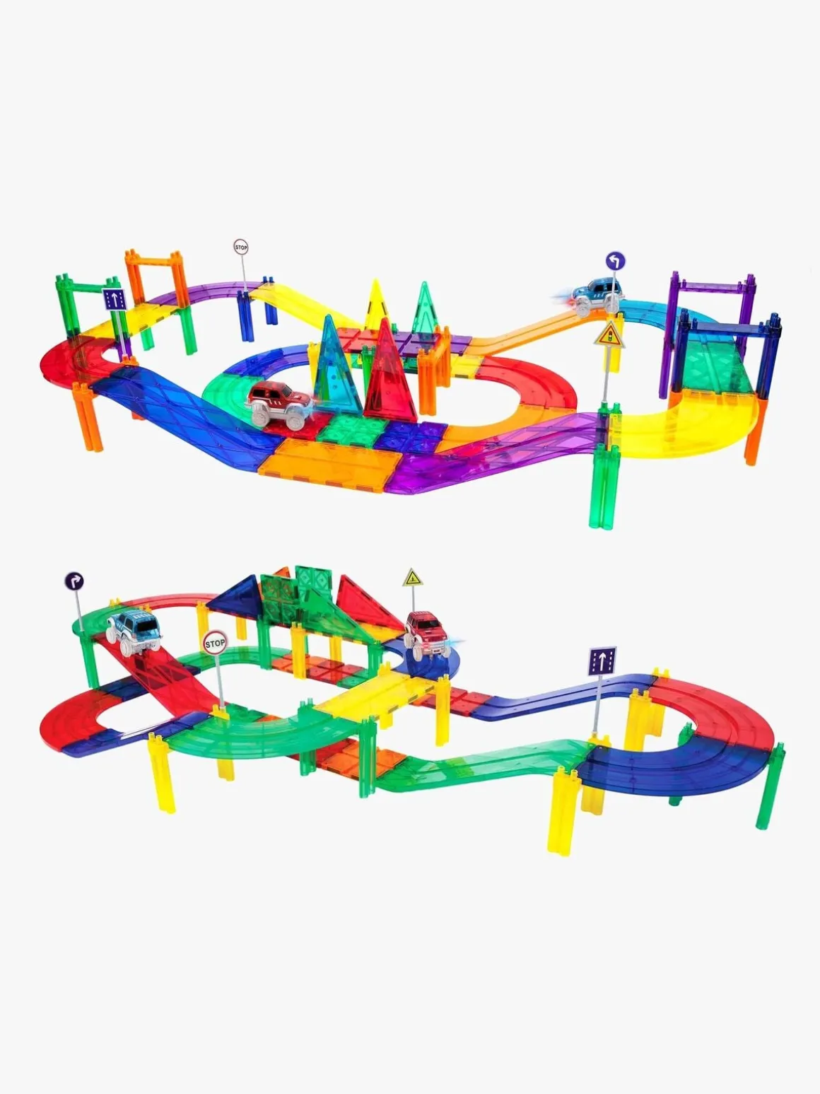 – Indeholder: 8 kvartsving, 12 firkantede baneplader, 16 søjler, 4 rektangulære baneplader, 4 triangler, 4 hældninger, 2 biler.