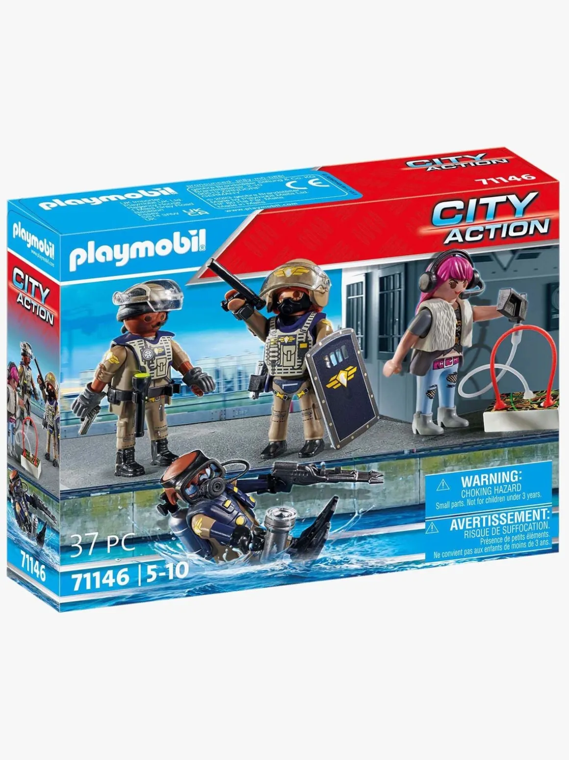 – Indeholder: Fire Playmobil-figurer (tre SWAT-indsatsstyrker og en kvindelig forbryder), dykkerflaske, hjelm, GPS, brækjern og masser af specialudrustning.
