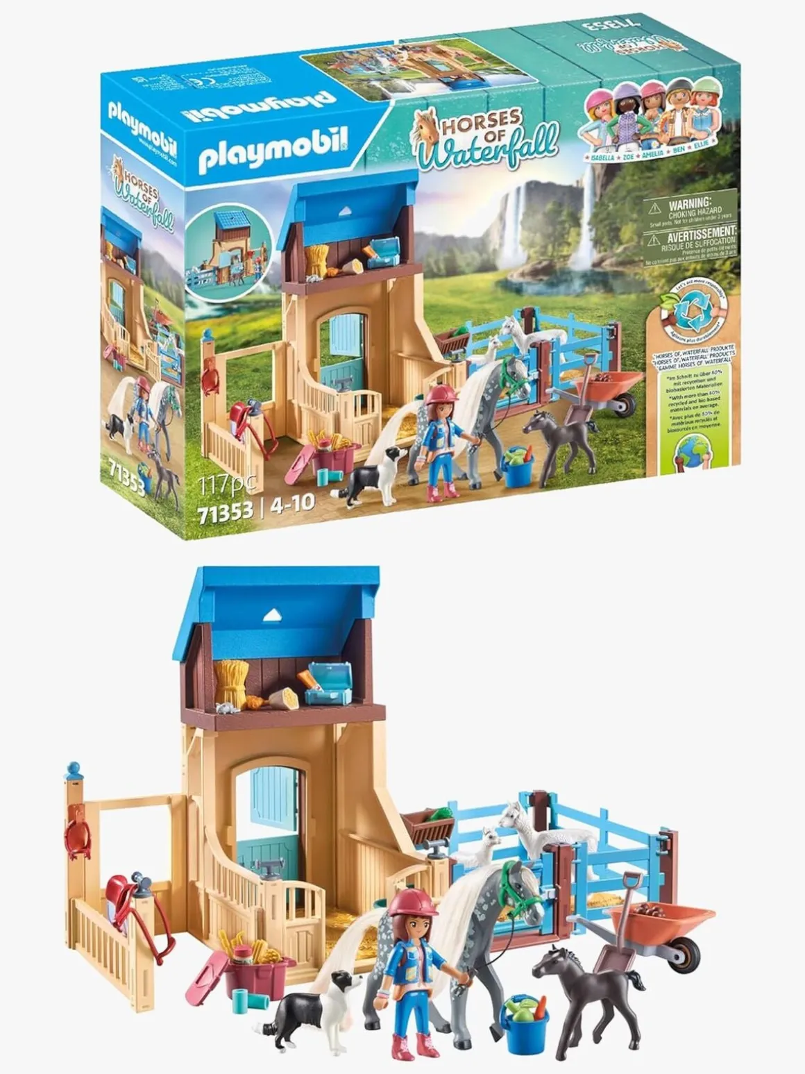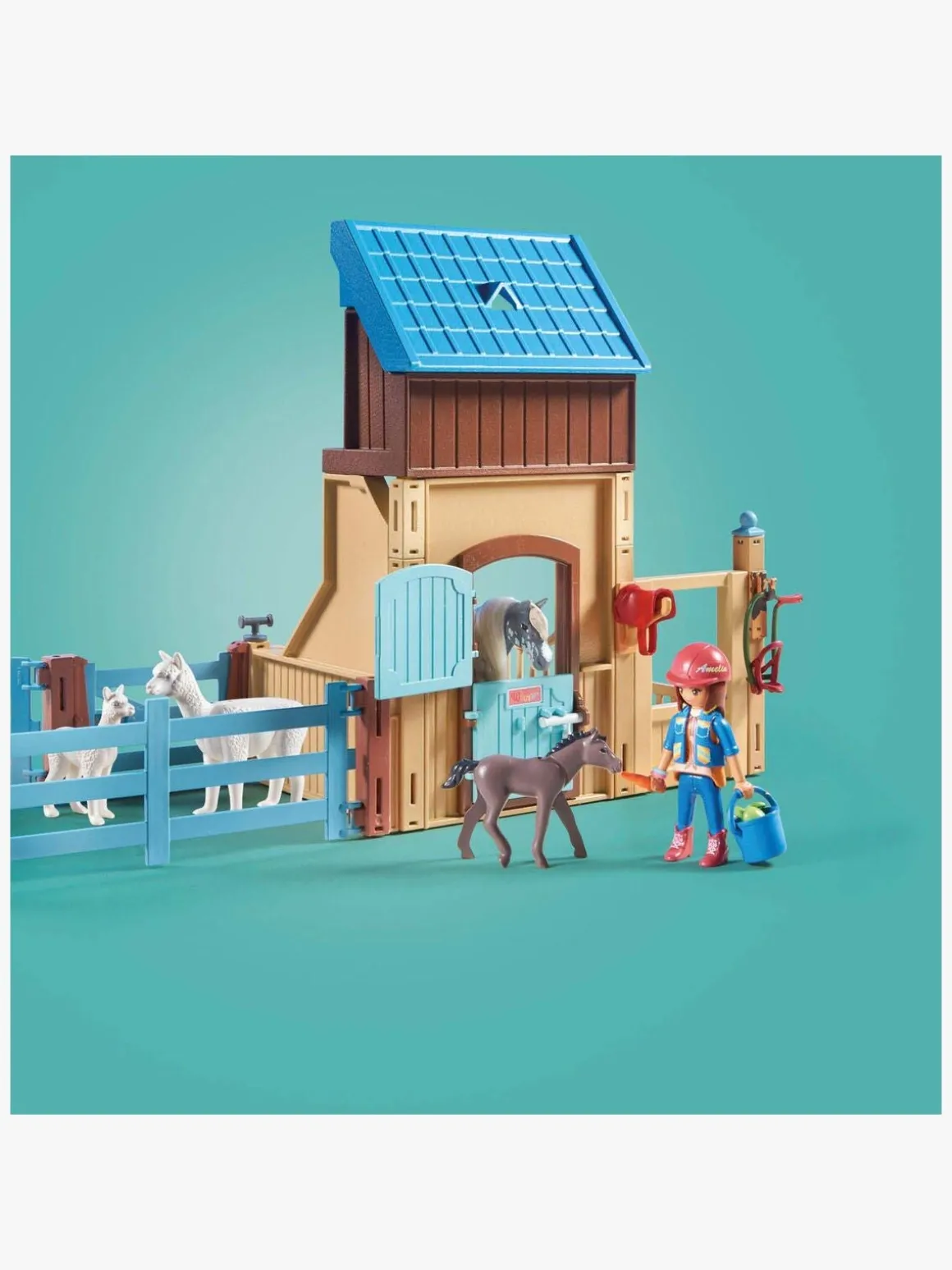 – Fint designet hestelegetøj med en PLAYMOBIL-figur, dyrevennen Amelia, hesten Whisper, et føl, en alpaka med unge, ridetilbehør og meget mere ekstraudstyr til spændende rolleleg.
