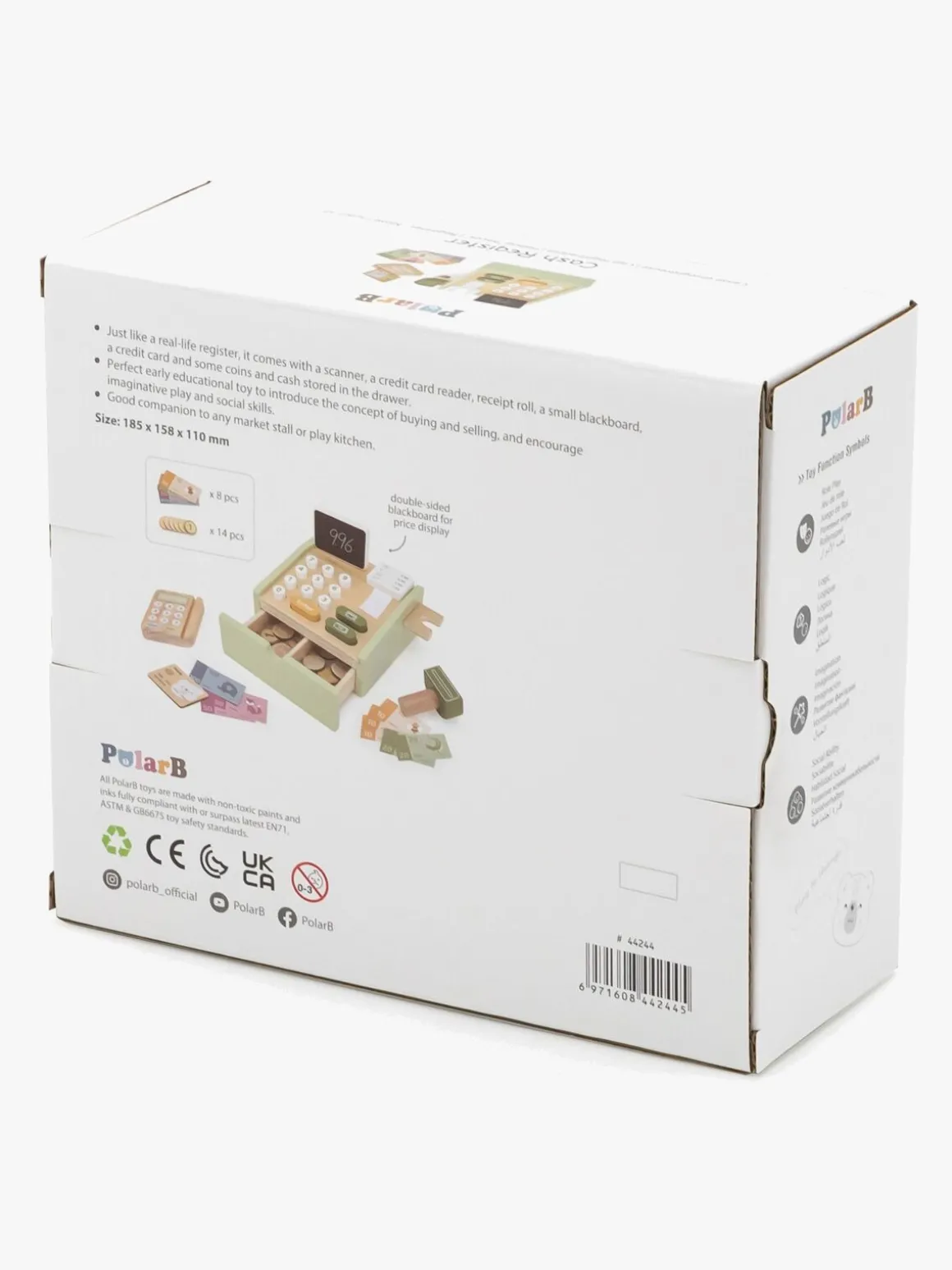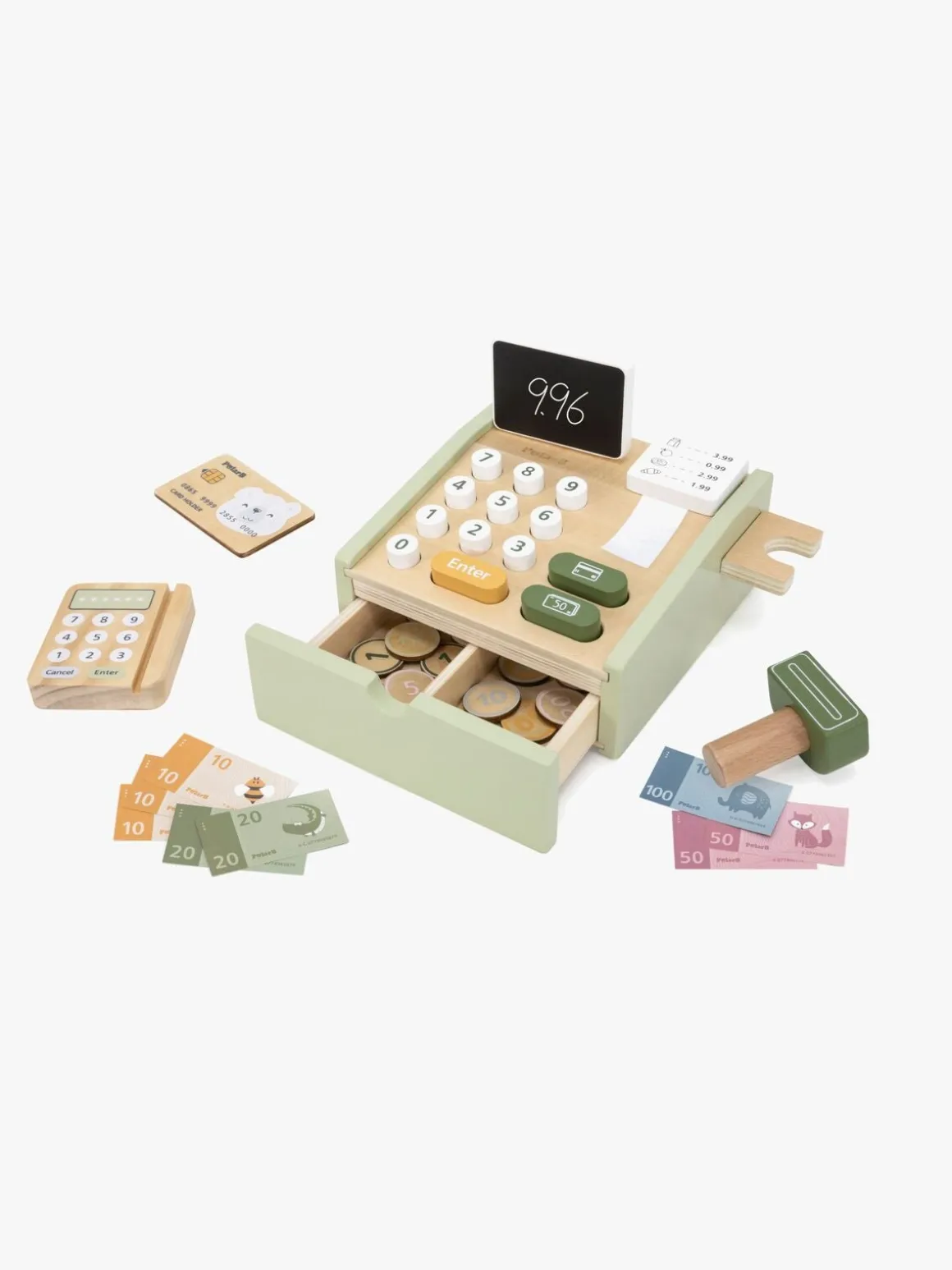 – Indeholder: 1 kasseapparat, 1 scanner, 1 kortlæser, 1 kreditkort, 8 legetøjspengesedler, 14 legetøjsmønter.