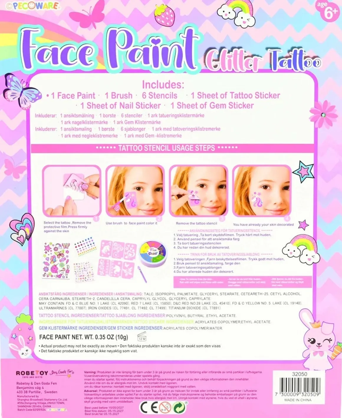 – Indeholder: 1 ansigtsmalingspalet, 1 pensel, 6 skabeloner, 1 ark med tatoveringsklistermærker, 1 ark med negleklistermærker og 1 ark med ædelstensklistermærker.
