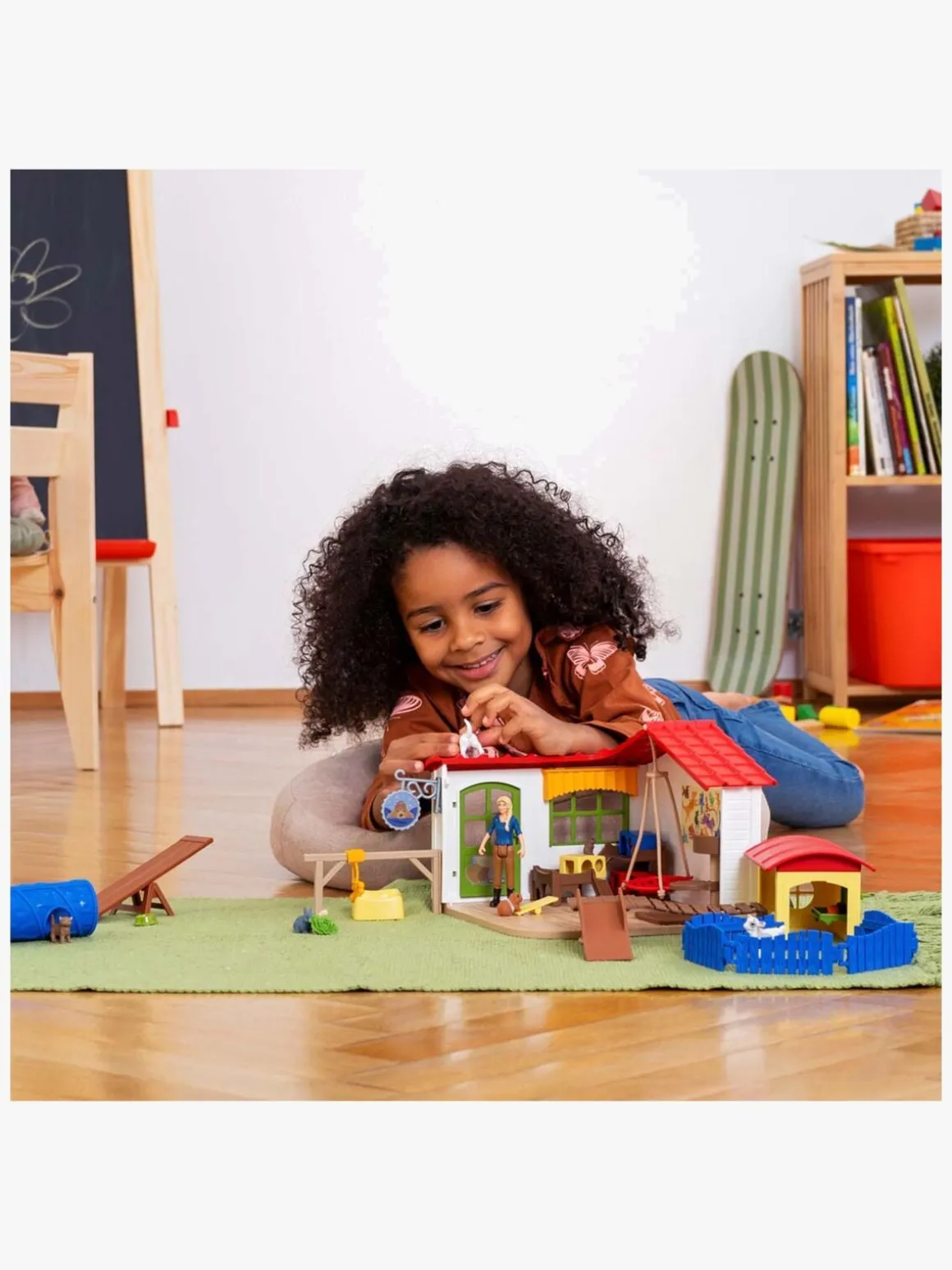 – Indeholder 8 dyr og en legeplads med tunnel, vippe og hegn.