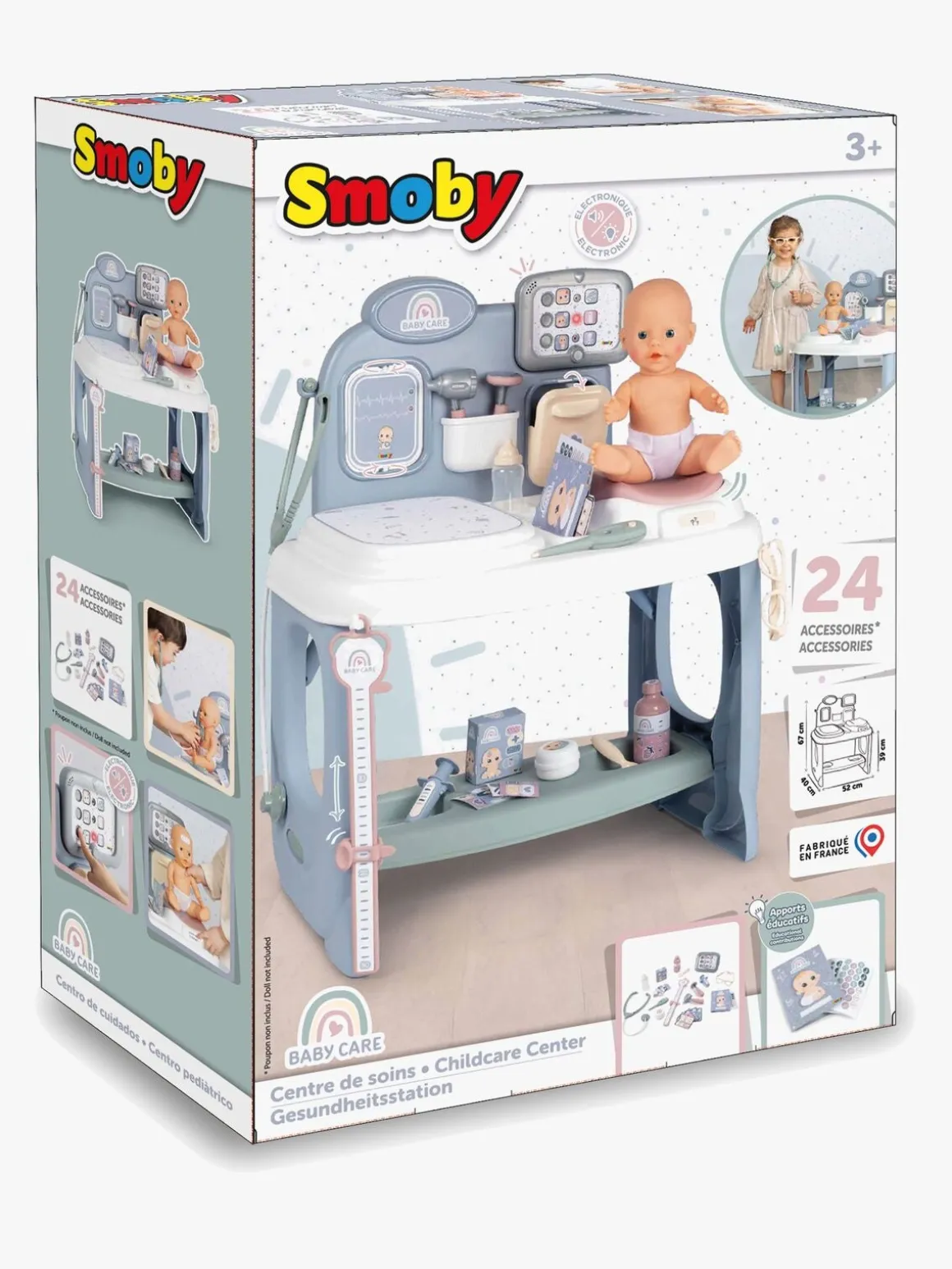 – Indeholder: 1 vægt, 1 stetoskop, 1 termometer, 1 reflekshammer, 1 førstehjælpskasse, 1 otoskop, 1 sundhedsjournal, 1 lægekontor.