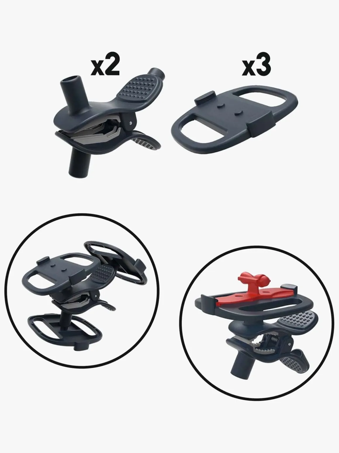 Multigrebsklemmen gør det muligt at sætte banen fast på mange forskellige ting, som fx borde, gardiner, hylder, stole, garderober, lagen, stænger osv. Klemmen kan sættes fast på forskellige måder og kan bruges med op til tre spor samtidigt.