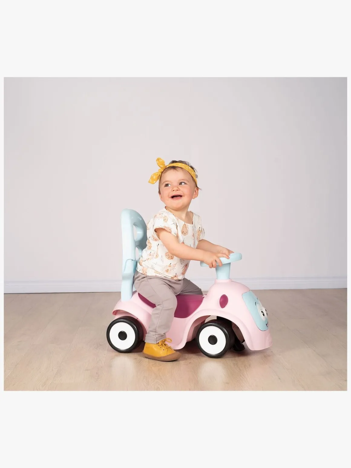 Fra 6 mdr. – brug bilen som en gyngestol med sikkerhedsring og justerbar sikkerhedssele. Når barnet bliver 8 mdr., kan den bruges som gåstol med fodstøtte og justerbart metalhåndtag, som forældrene kan holde i. Fra 10 mdr. giver den barnet støtte til at gå ved hjælp af håndtaget bagtil. Fra 12 mdr. kan Maestro bruges som en rigtig gåbil.