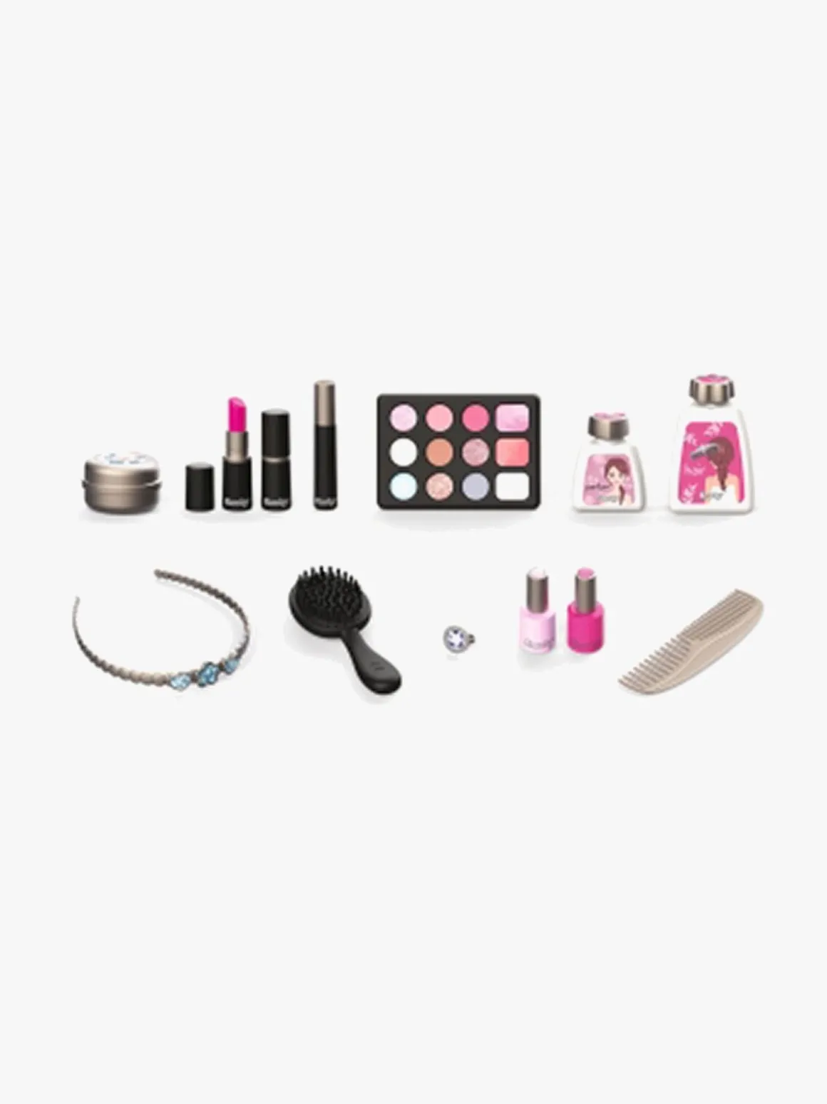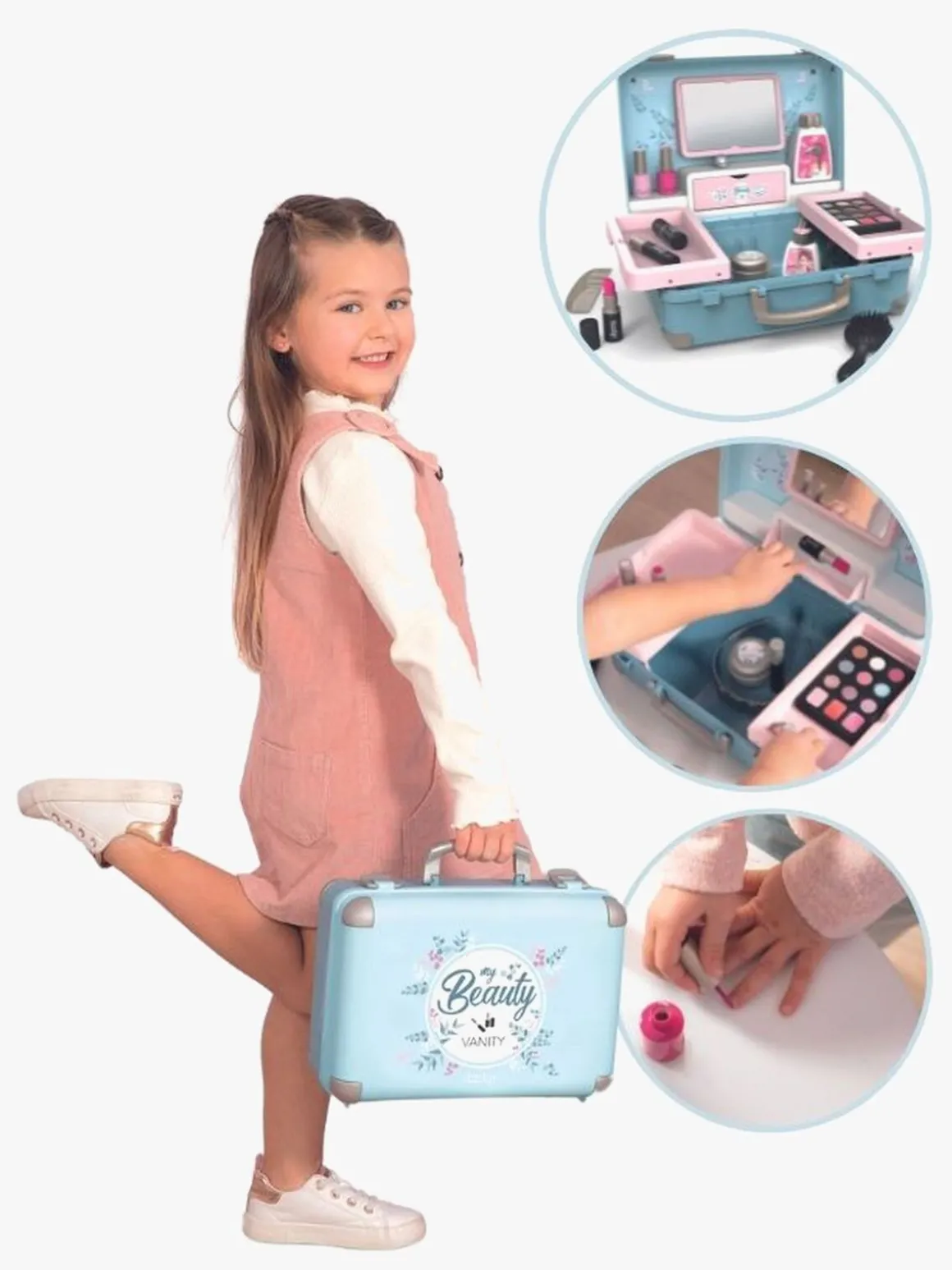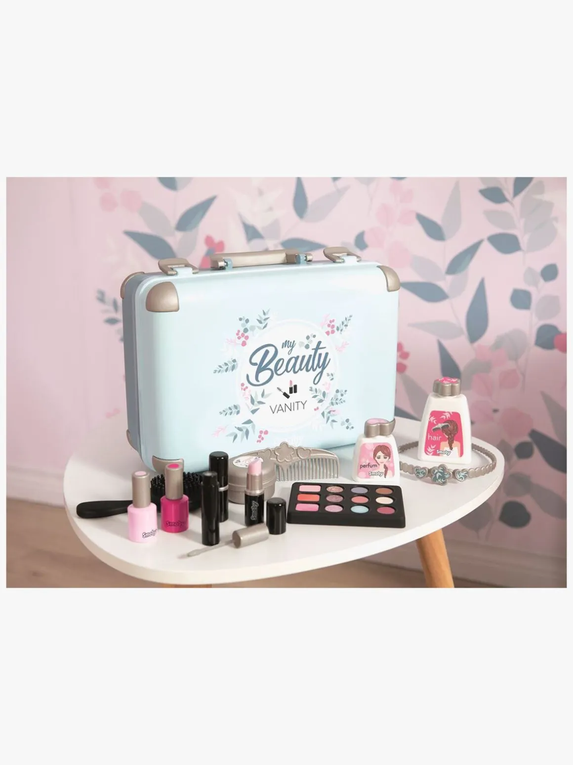 Det er let at transportere æsken med håndtaget og den lukkes med to hængsler. Med de 13 dele er der lagt op til mange times skønhedsleg. Du får 2 neglelak, 2 læbestifter, 1 øjenskyggepalet, 1 mascara, 1 kam, 1 børste, 1 hårbøjle og 1 ring. Æsken har et ægte spejl og et ekstra lille rum til dine hemmelige ting.