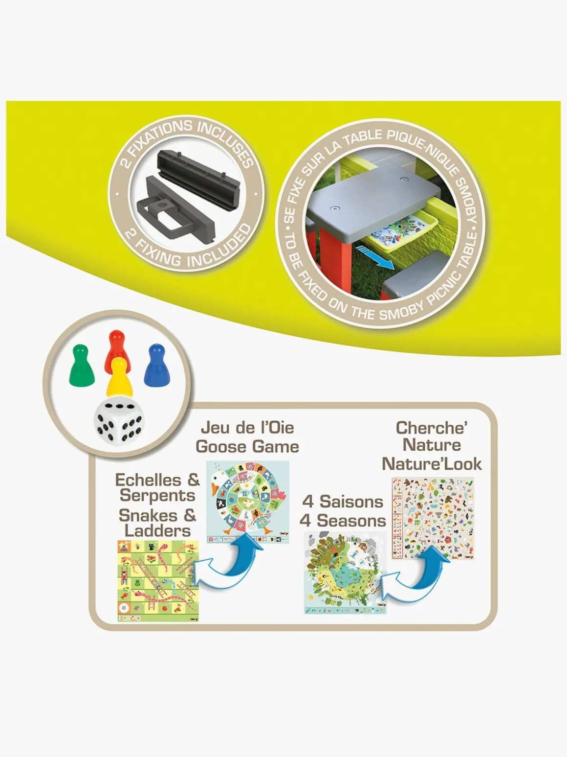 – Fastgøres på Smoby Neo Jura picnicbord (sælges separat).