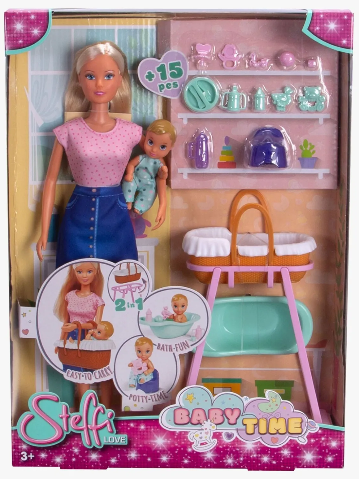 – Indeholder: 1 Steffi-dukke, 1 baby, 15 tilbehør.